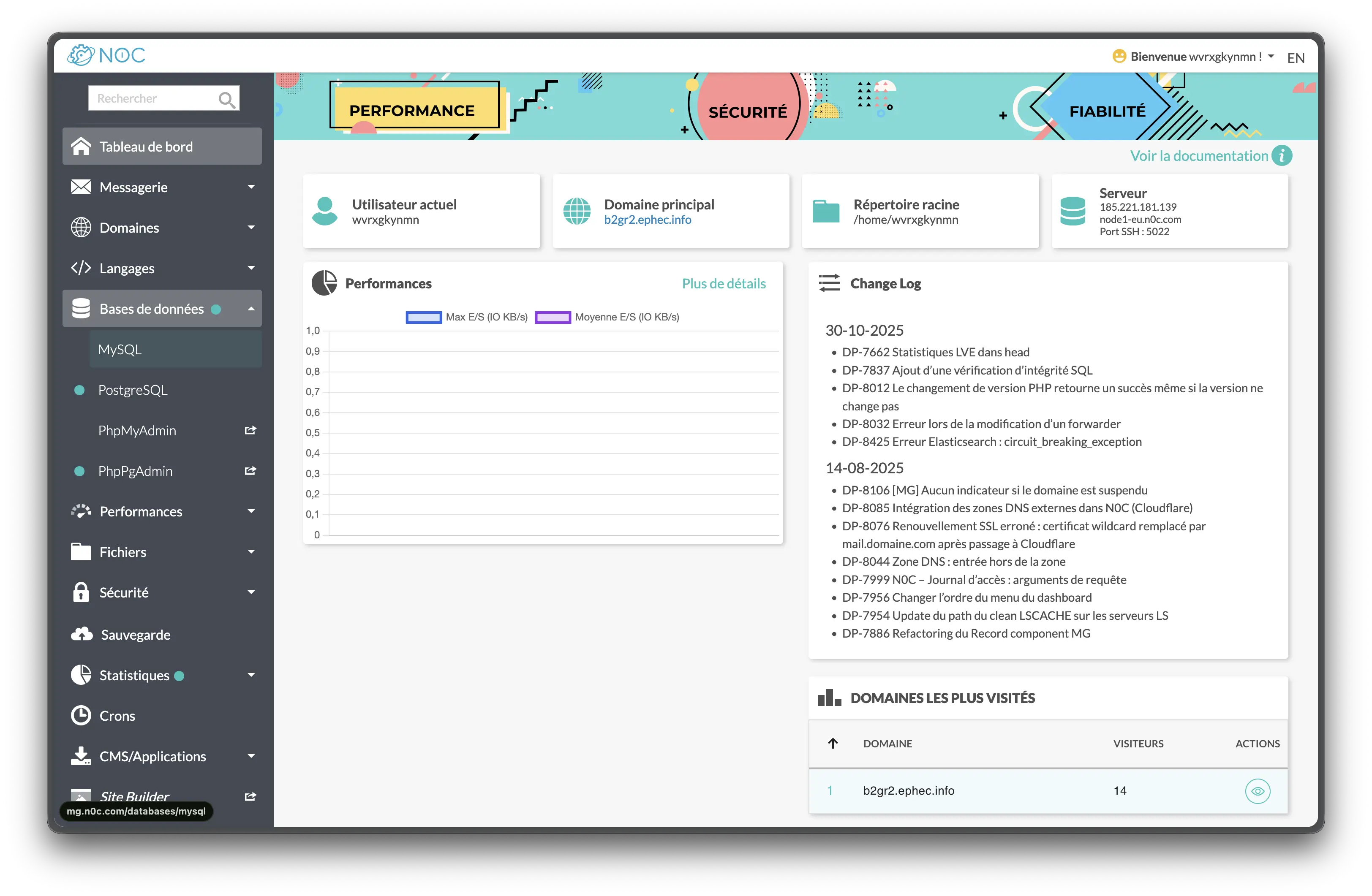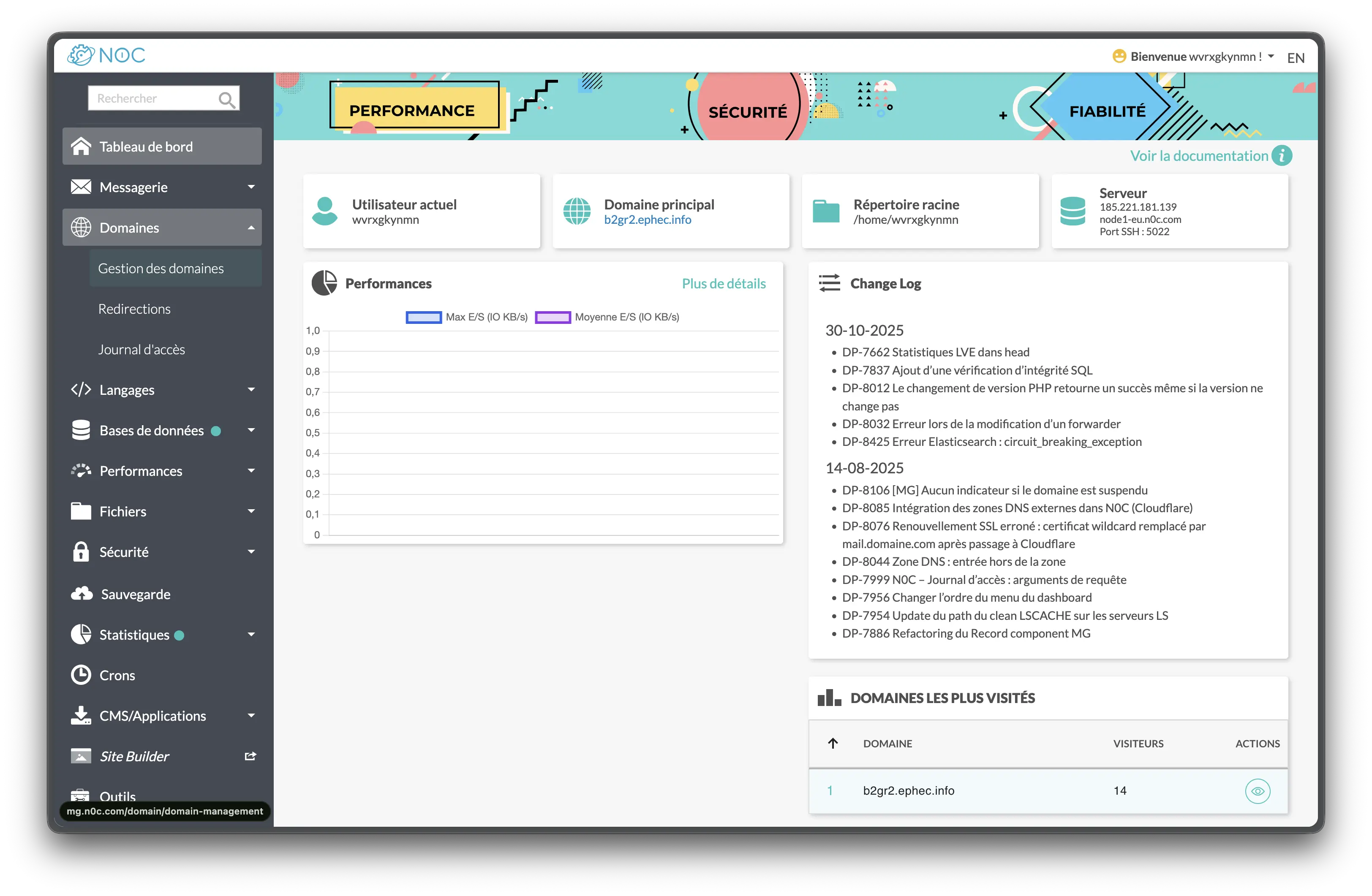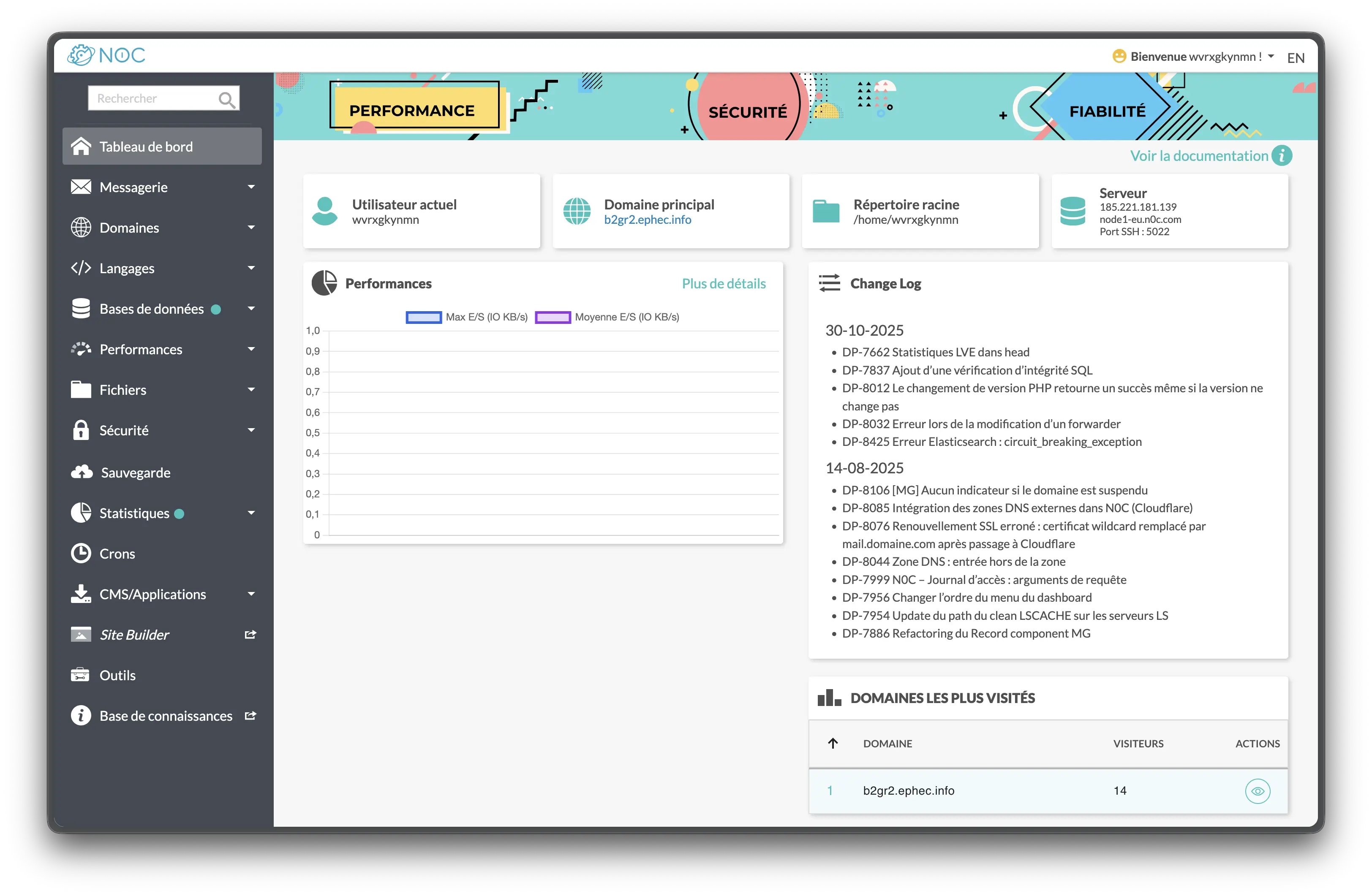 Le dashboard donne accès à tous les paramètres de votre nom de domaine. Attention, vous êtes responsable du bon fonctionnement, n'y faites pas n'importe quoi.
