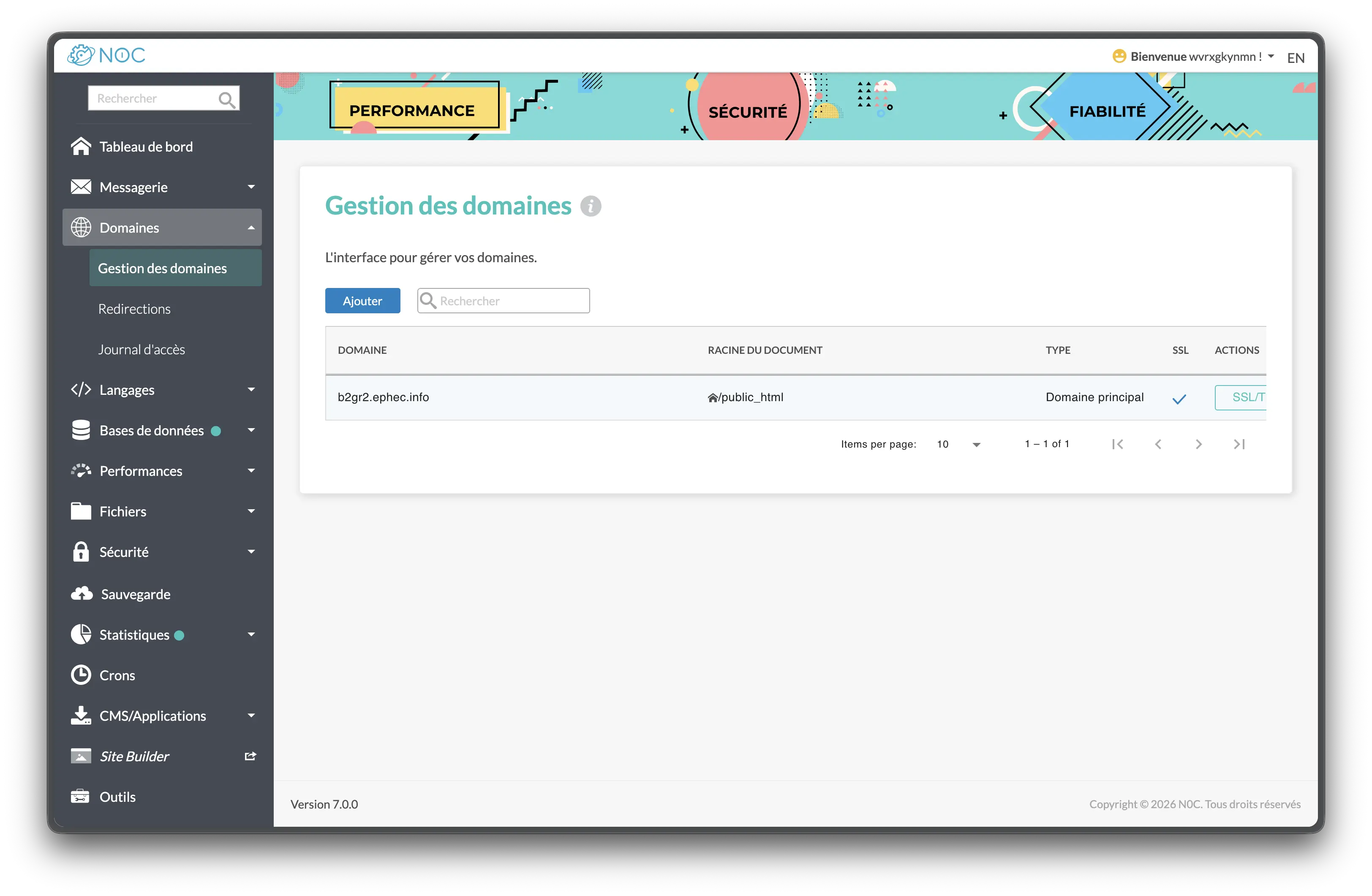Depuis la colonne de gauche se trouve les différents menus. Notamment Domaines > Gestion des domaines et qui permettent de les lister. Chaque groupe à son domaine, vérifiez que le vôtre ait bien la colonne SSL de cochée, cela active le protocol https.