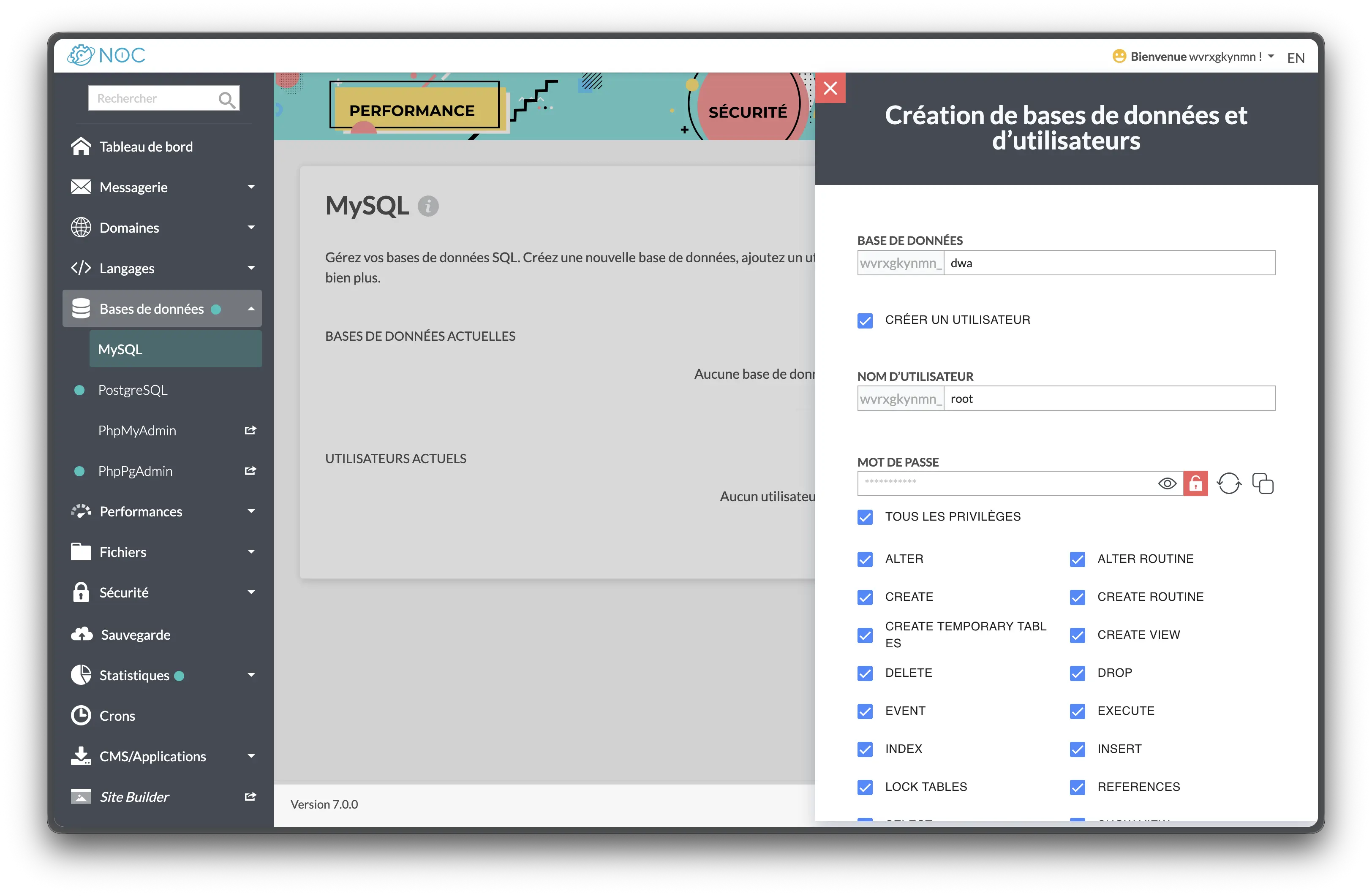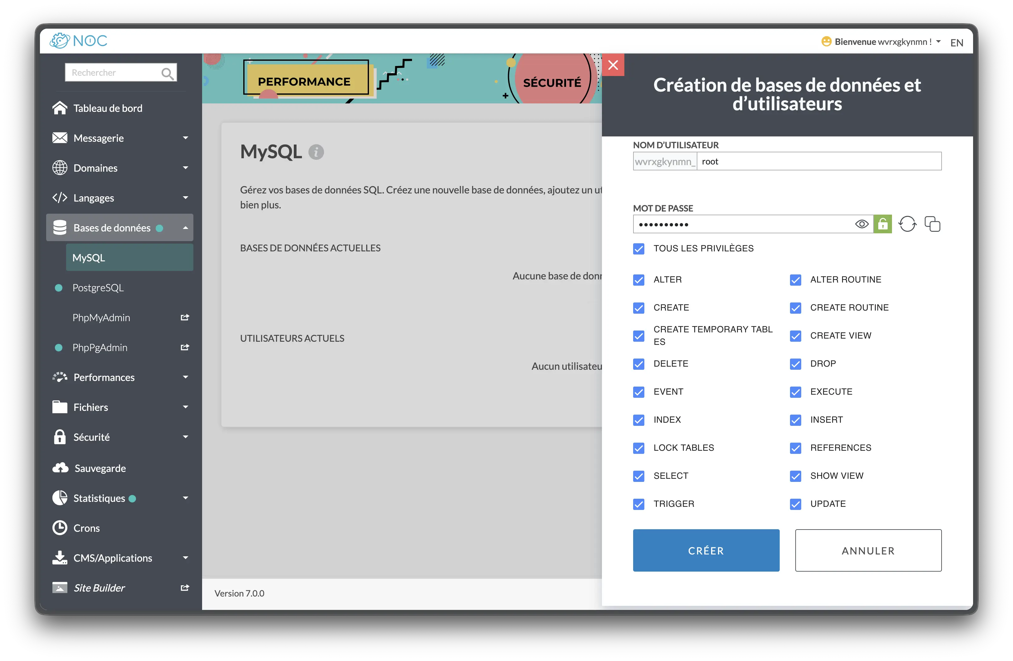 À l'extrême droite de Bases de données actuelles se trouve 2 boutons, dont Créer. Ce bouton ouvre un menu permettant d'y nommer une nouvelle base de données ainsi que de créer un nouvel utilisateur avec des accès.