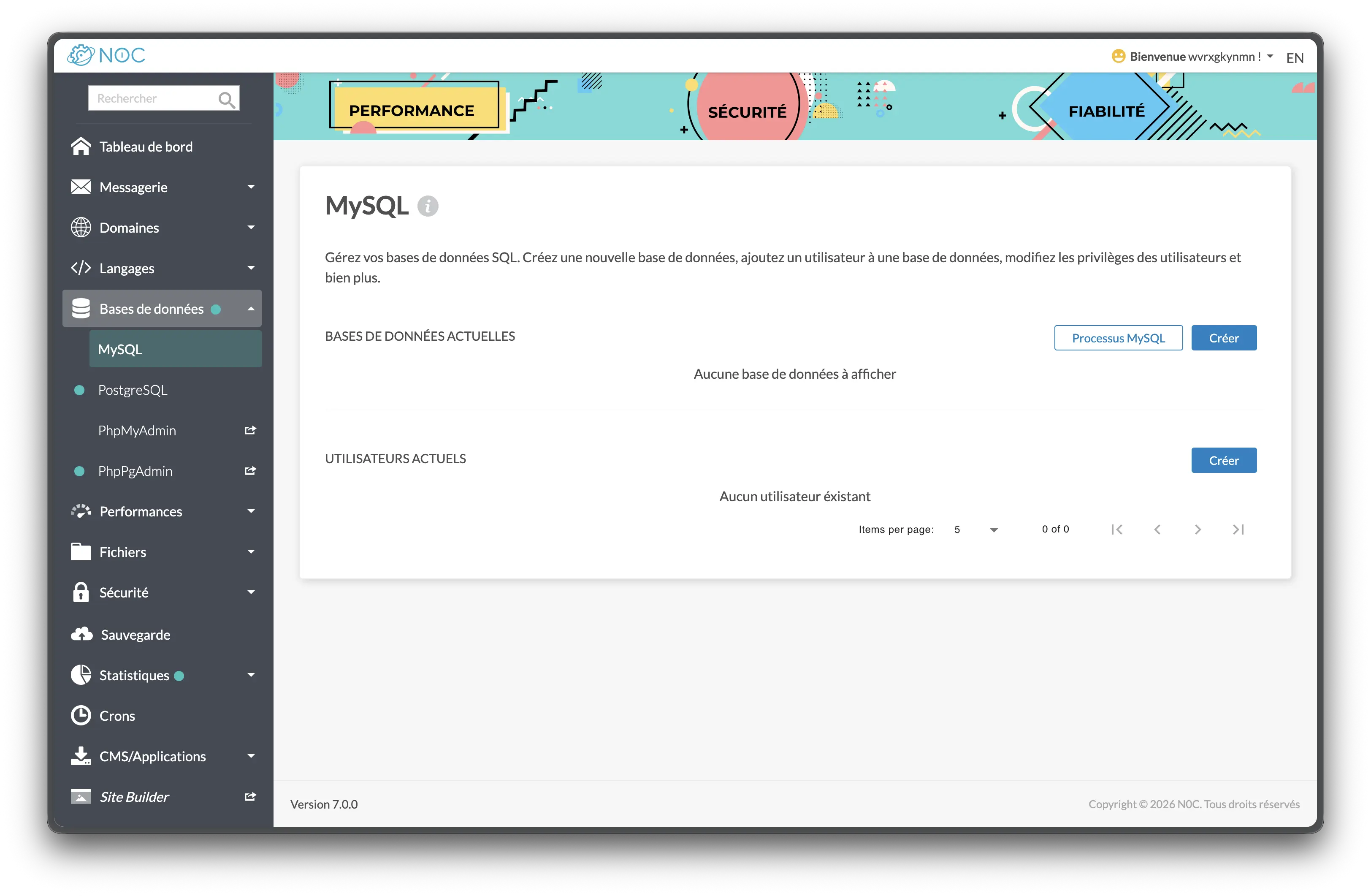Dans le menu de gauche se trouve Base de données > MySQL qui permet de gérer les différentes bases de données liées à votre nom de domaine. Pour le moment il n'y a en pas, il va falloir en créer une.