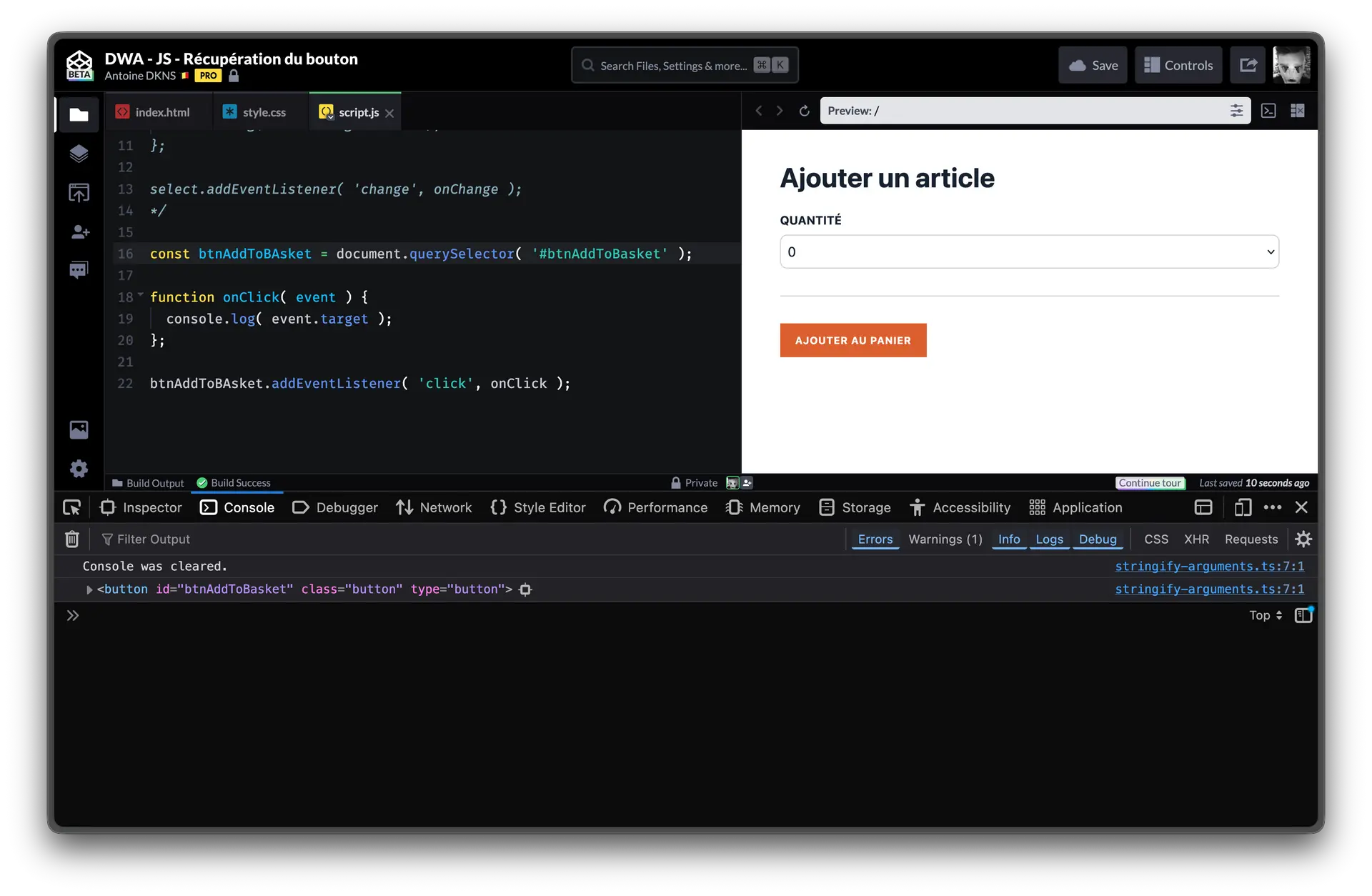 Prochaine étape : récupérer la valeur de notre formulaire quand on clic sur le bouton ajouter au panier. Commençons par récupérer notre button avec un querySelecto via une id btnAddToBasket que nous allons lui rajouter :