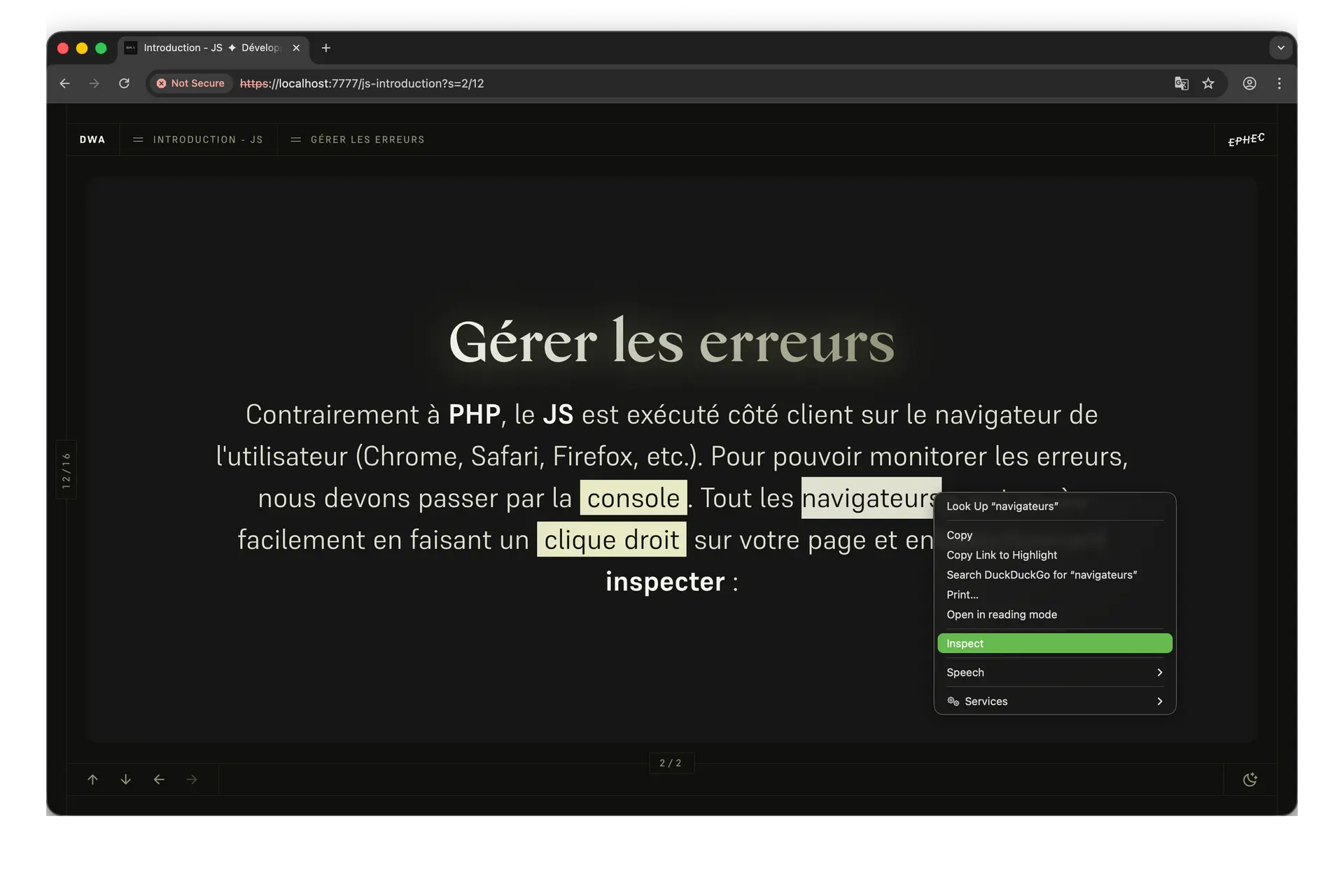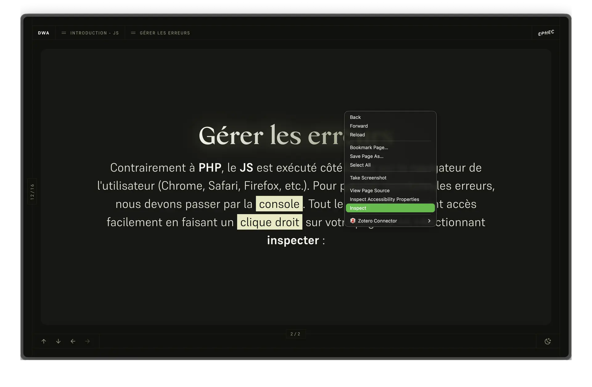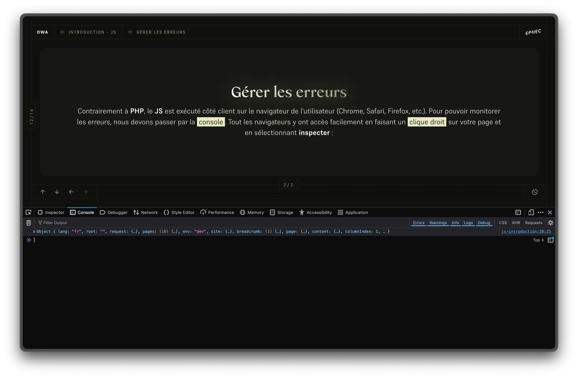 Contrairement à PHP, le JS est exécuté côté client sur le navigateur de l'utilisateur (Chrome, Safari, Firefox, etc.). Pour pouvoir monitorer les erreurs, nous devons passer par la console. Tout les navigateurs y ont accès facilement en faisant un clic droit sur votre page et en sélectionnant inspecter et en activant l'onglet console :