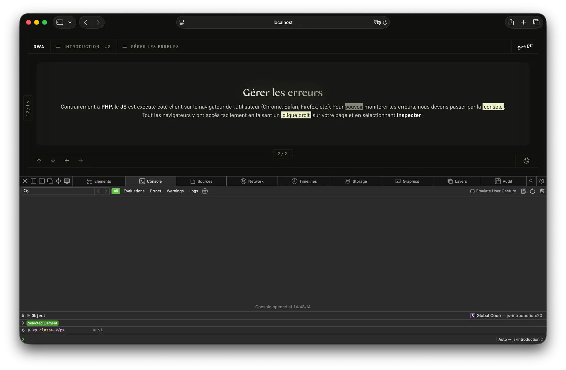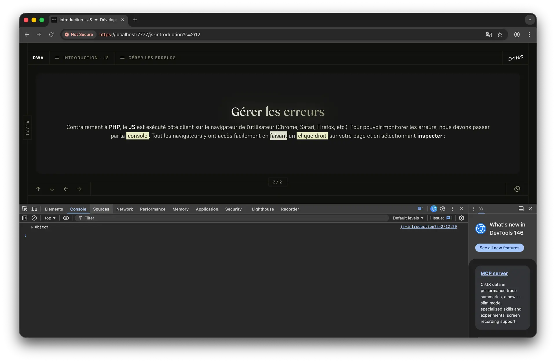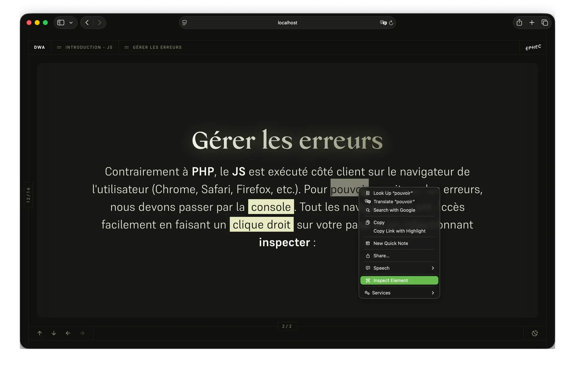 Contrairement à PHP, le JS est exécuté côté client sur le navigateur de l'utilisateur (Chrome, Safari, Firefox, etc.). Pour pouvoir monitorer les erreurs, nous devons passer par la console. Tout les navigateurs y ont accès facilement en faisant un clic droit sur votre page et en sélectionnant inspecter et en activant l'onglet console :