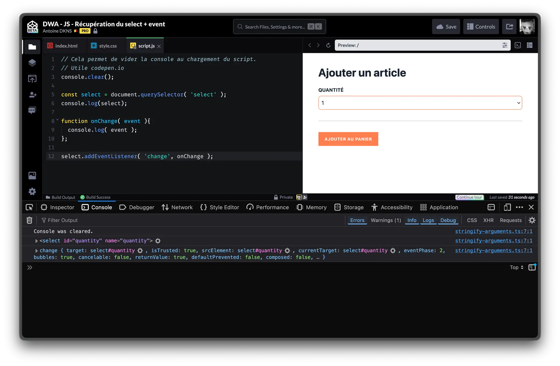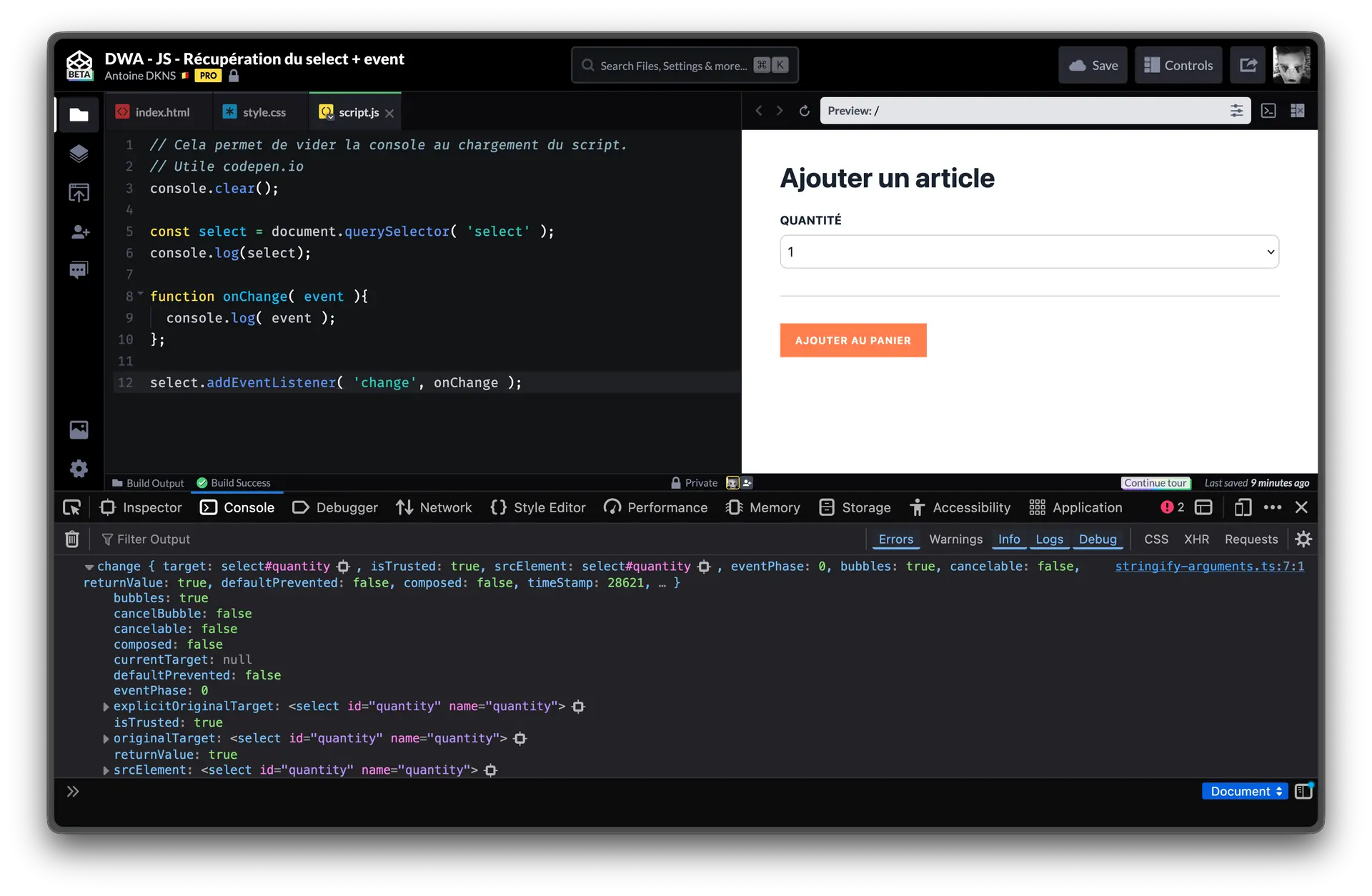 Maintenant que nous avons notre select accessible via une variable, on va pouvoir écouter les changements effectués par l'utilisateur. Cela passe par l'ajout d'un évènement.