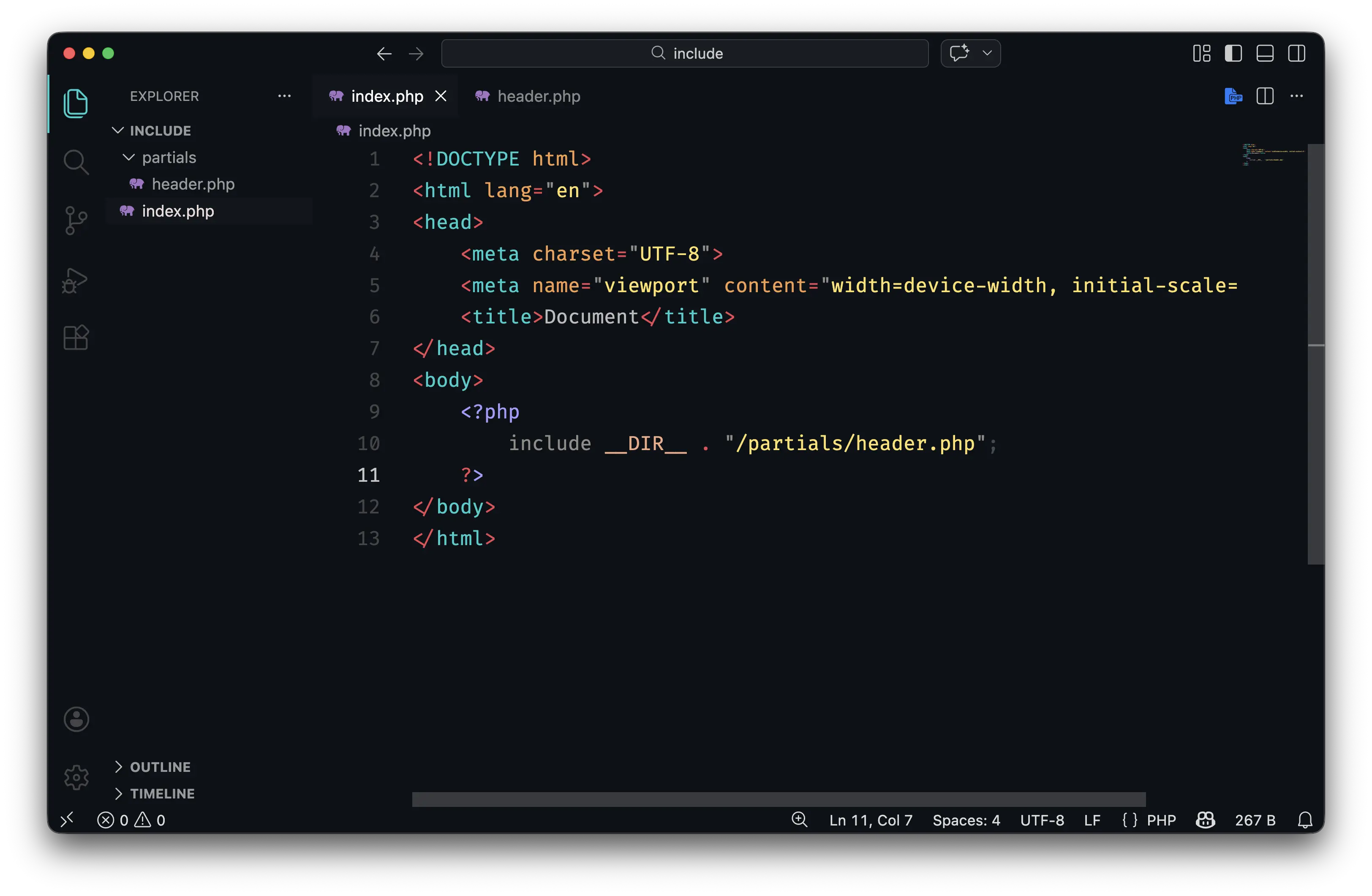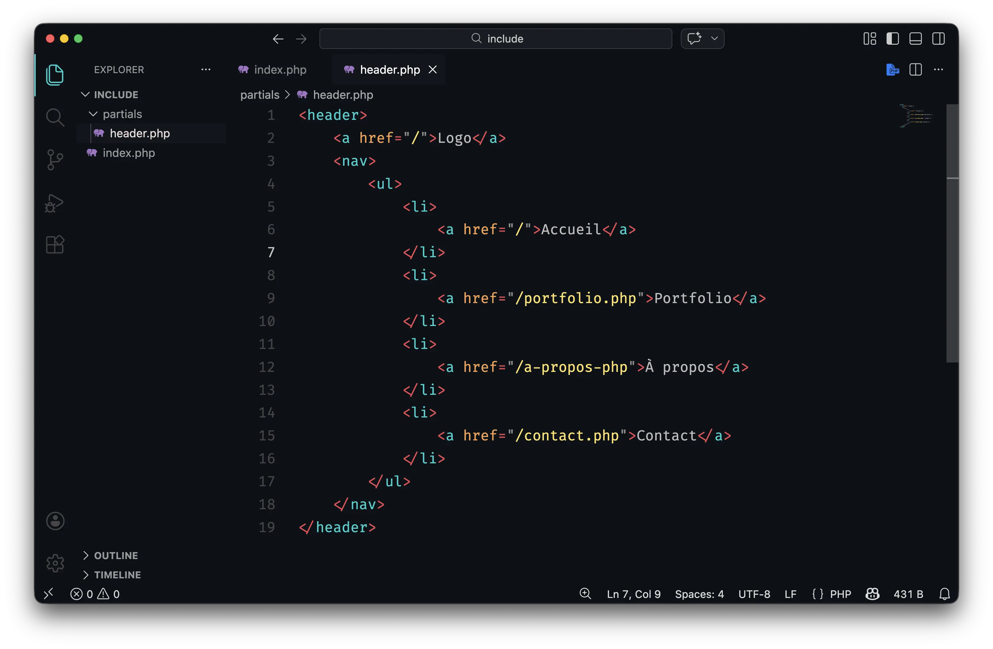 Une fois que notre projet à plusieurs pages, nous nous retrouvons à écrire plusieurs fois les mêmes parties en HTML qui sont similaires entre elles comme la navigation ou le bas de page. Le mot clé include permet de d'insérer le code d'un fichier dans un autre :
