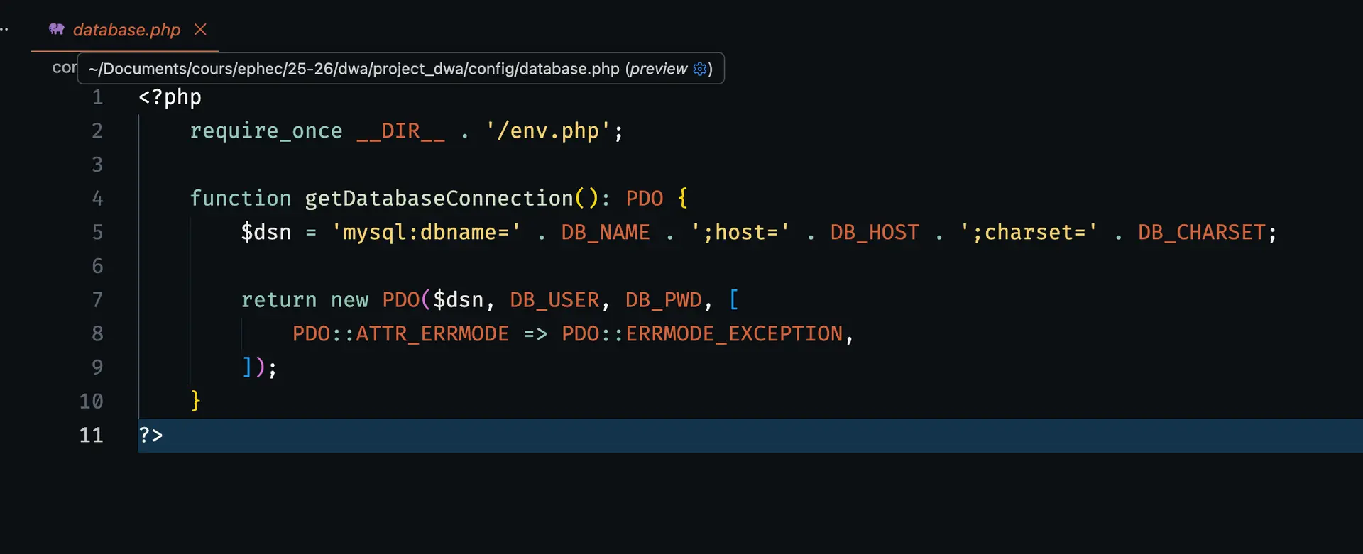 La première chose que doit contenir ce fichier est une fonction de connexion via PDO que nous pourrons utiliser une fois inclus dans les différentes vues où nous voulons interagir avec notre base de données.