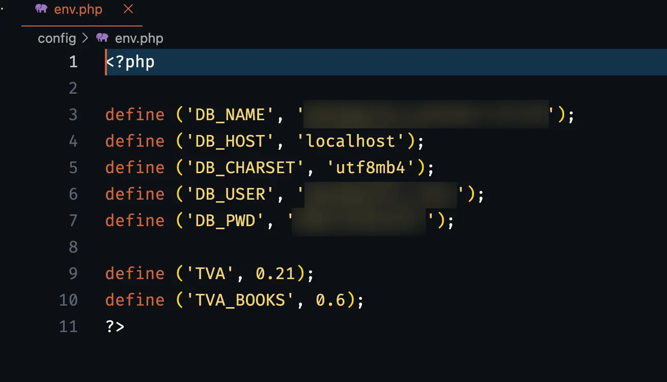 Avoir un fichier centralisant nos constantes (nom de base de données, utilisateur, mot de passe, etc.) nous évitera les répétitions et les erreurs potentiels liés aux fautes de frappes.