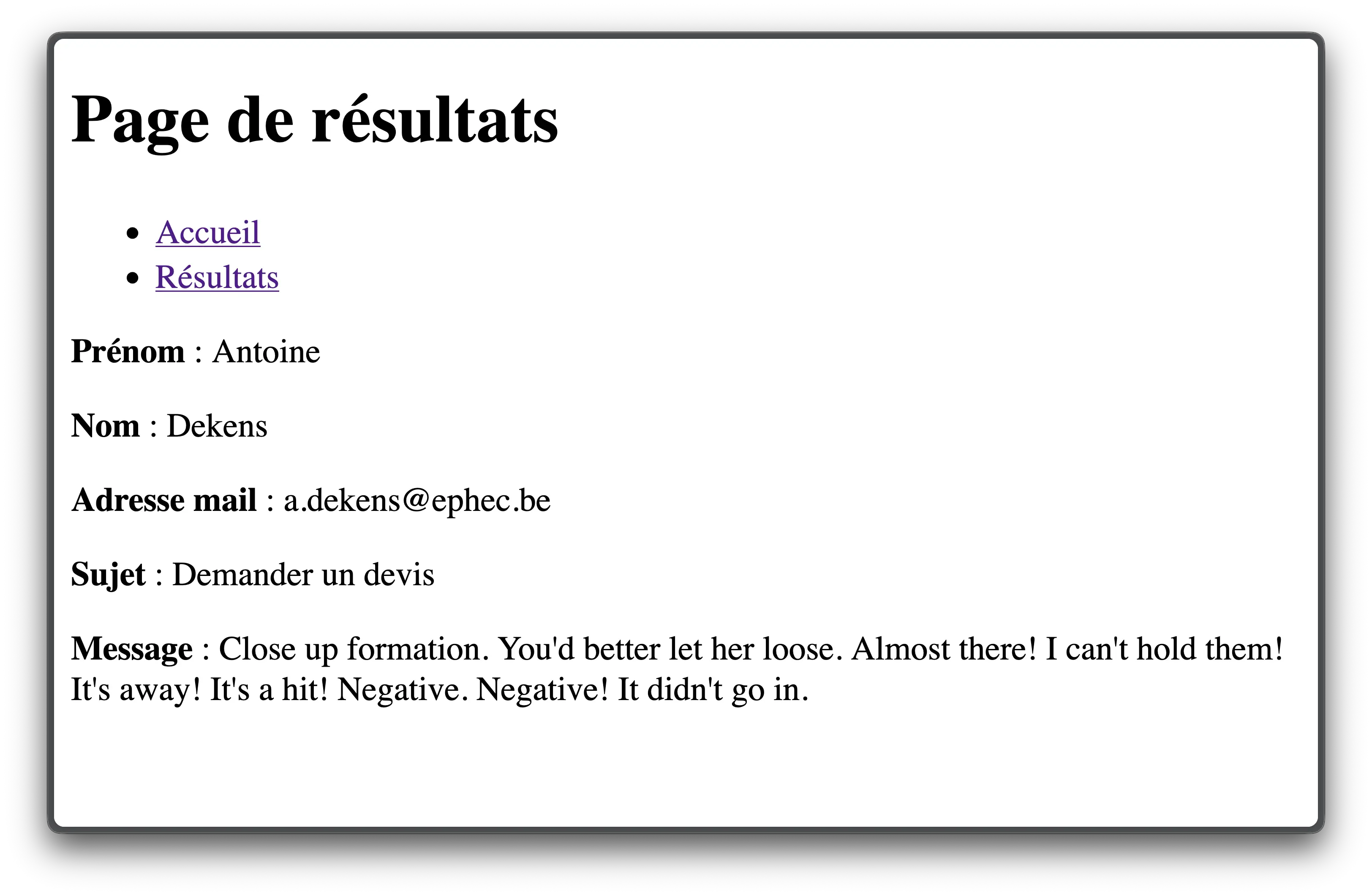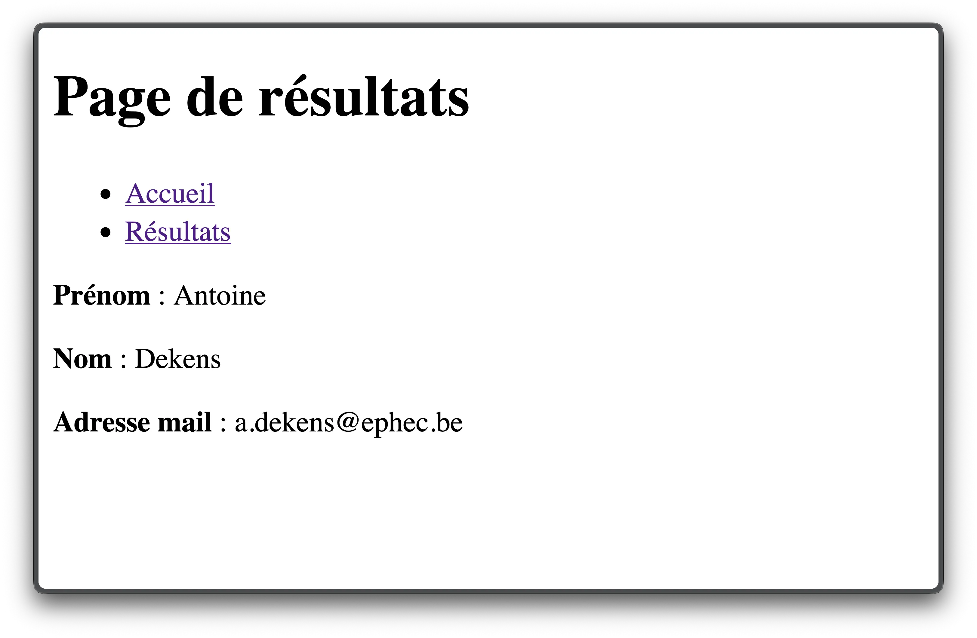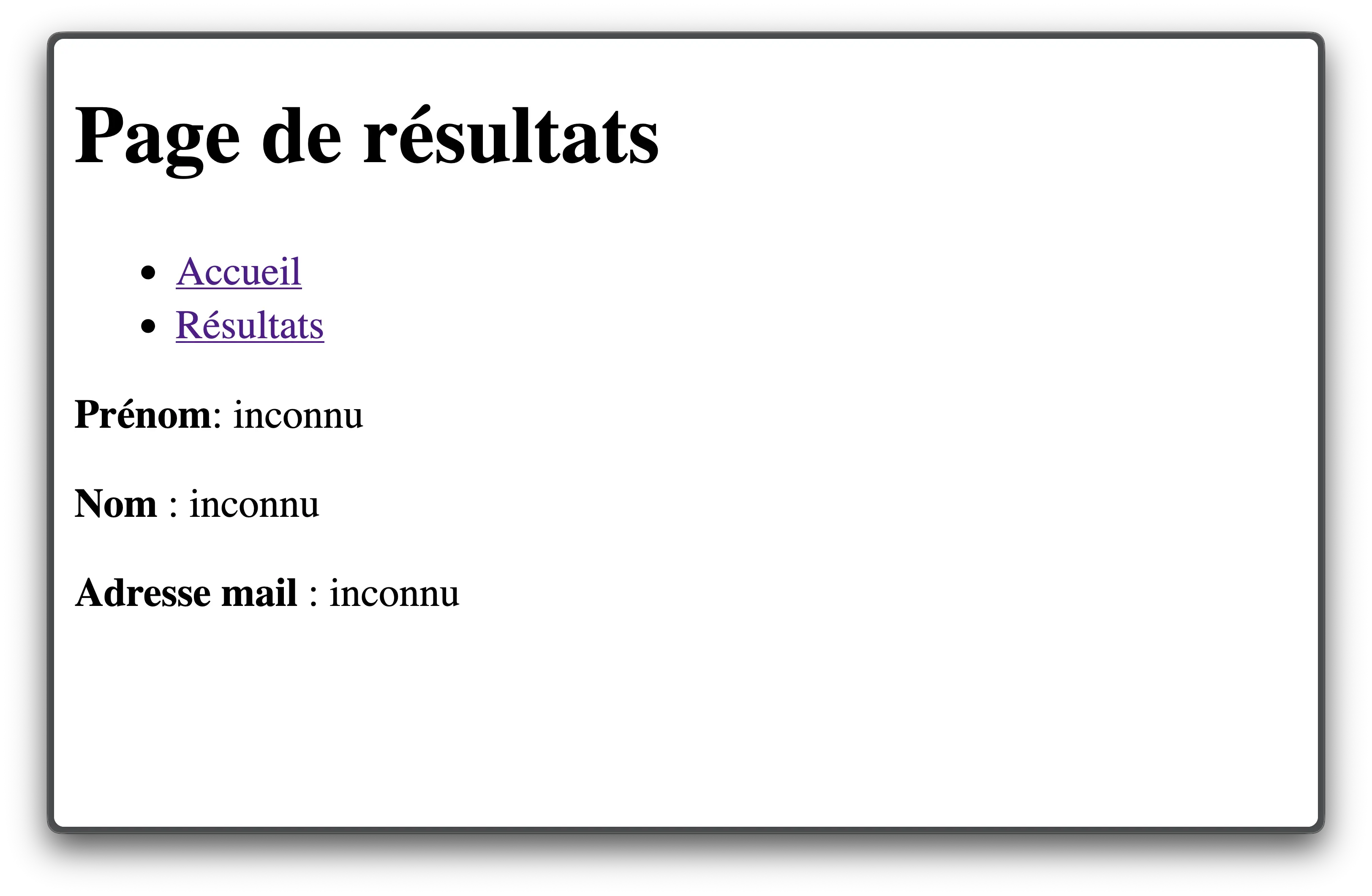 Afficher la valeurs des 3 champs dans la page results.php comme sur l'image suivante. Il faut aussi prévoir les cas de figures où les champs sont vides.