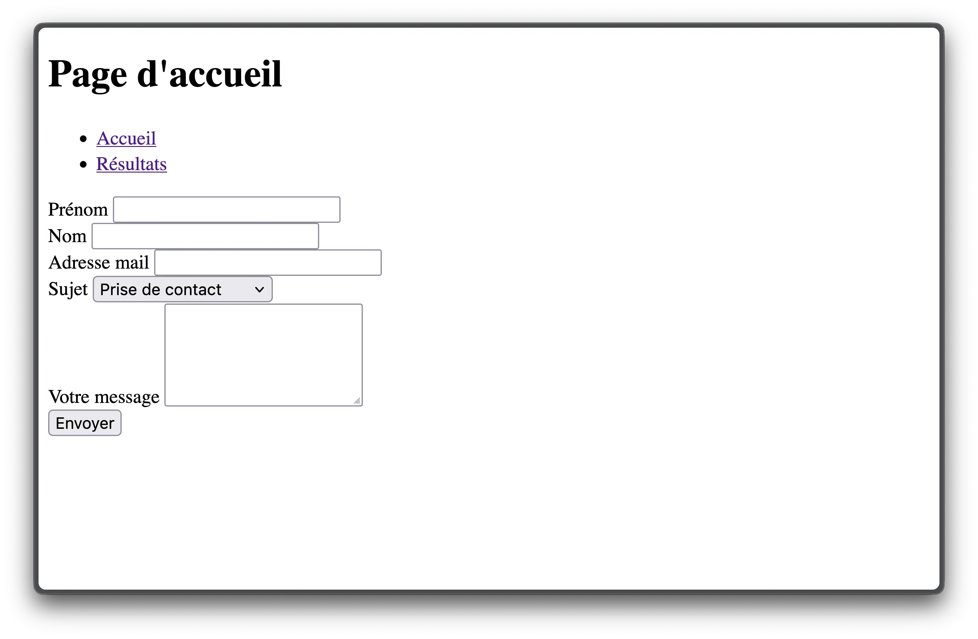 Tansformer en formulaire de contact en ajoutant 2 champs et les afficher dans la page de results.php : un select pour choisir le sujet, et un champ textarea pour y inscrire un message. 3 options sont disponibles :