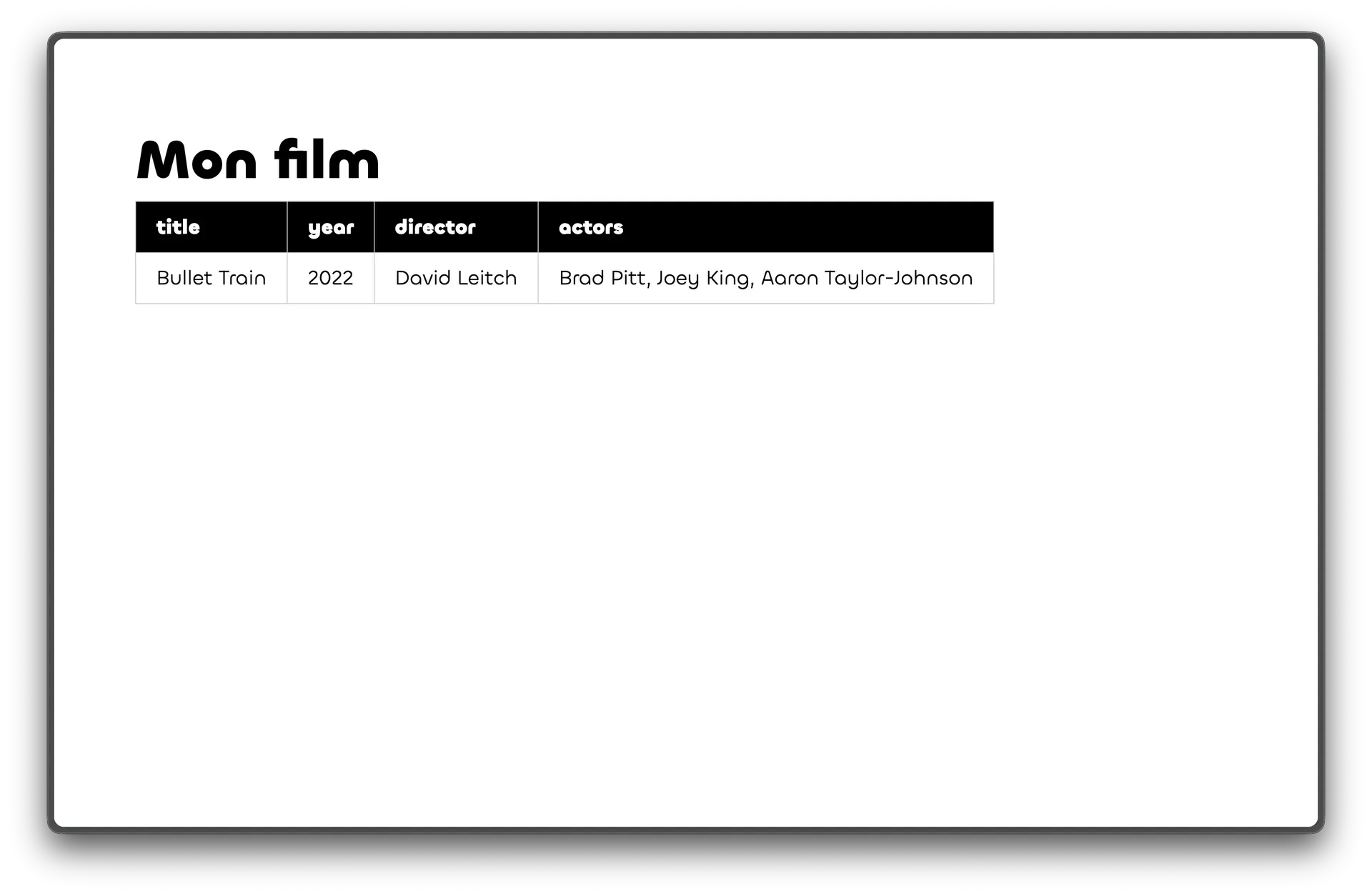 Créer un tableau associatif d'un film, qui reprend les clés suivantes et ensuite les afficher avec leurs valeurs dans un tableau HTML :