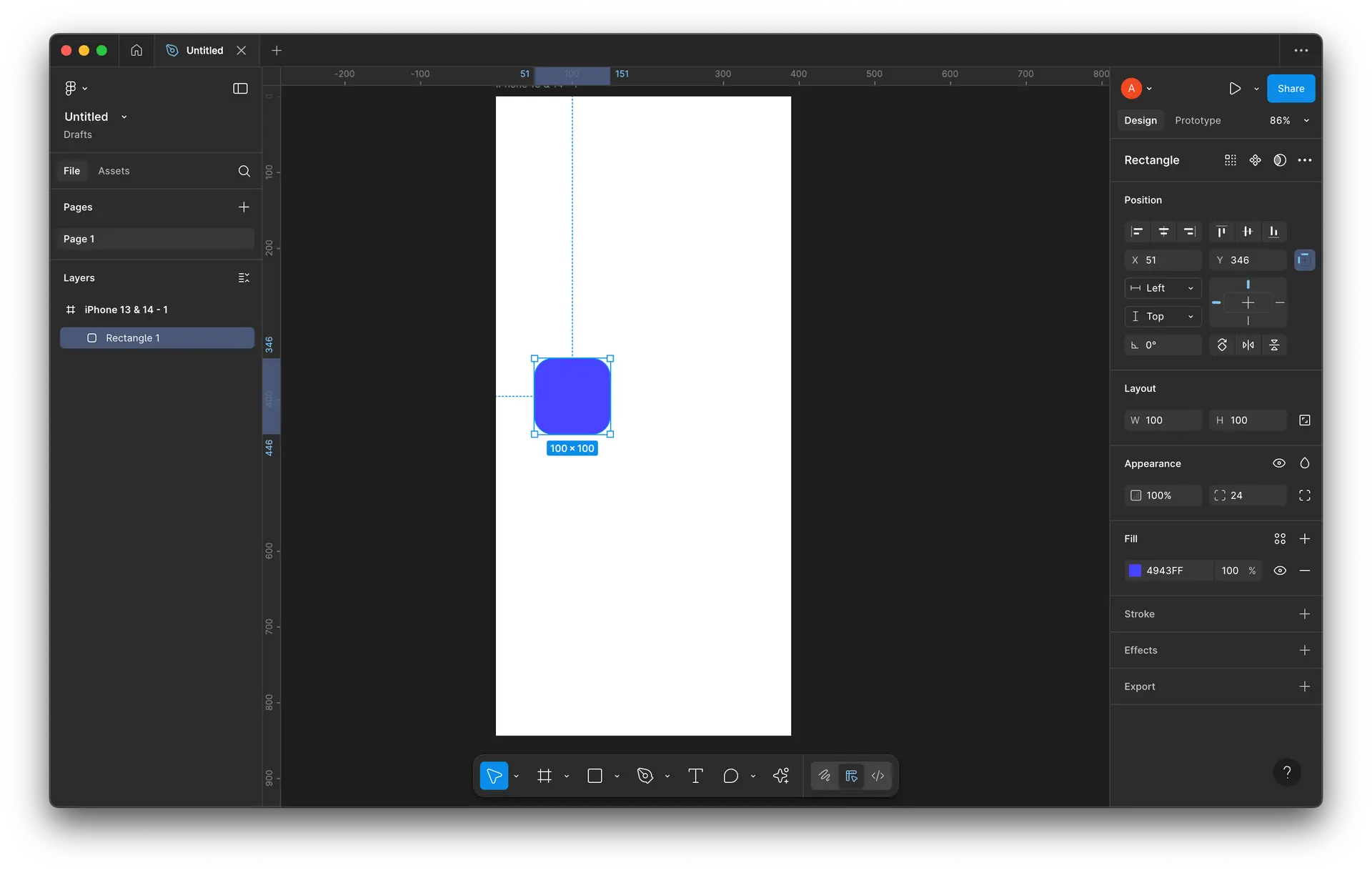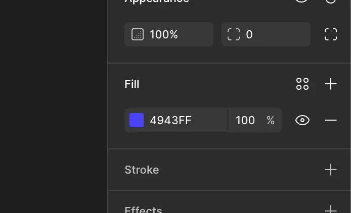 La couleur de remplissage permet de changer la couleur de fond de l'élément actuellement selectionné. Changeons la couleur grise de notre rectangle en un bleu #4943FF.
