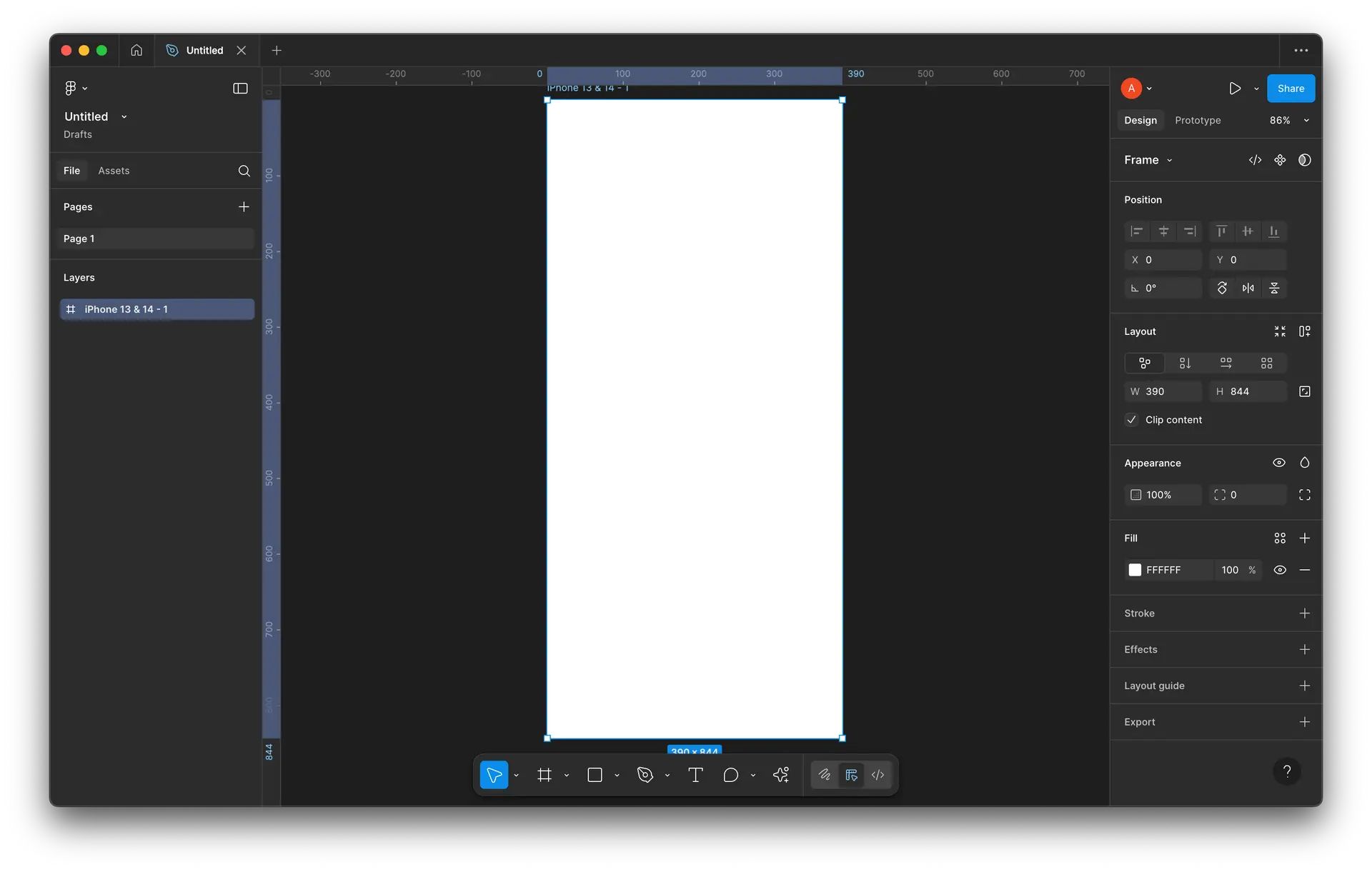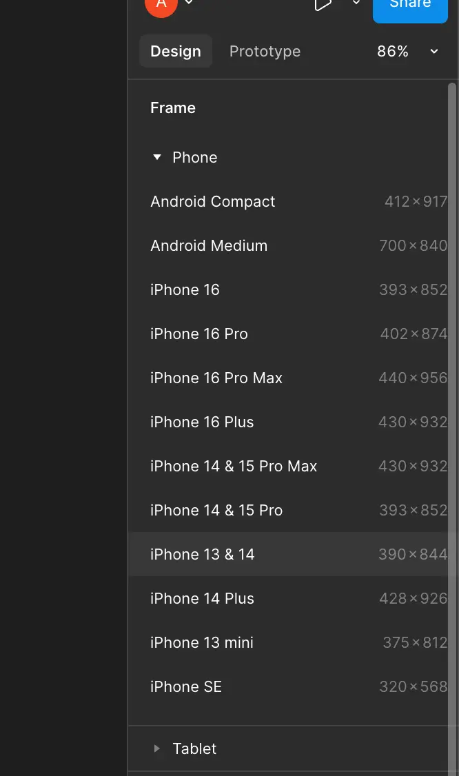 Une fois l'outil selectionné, des tailles prédéfinies apparaissent dans le panneau des propriétés. Nous allons choisir Phone > iPhone 13 & 14 (390 x 844).