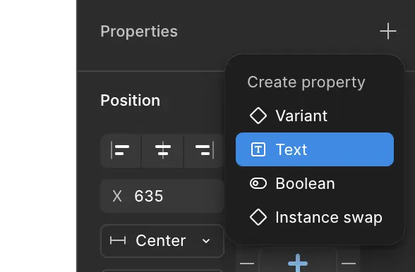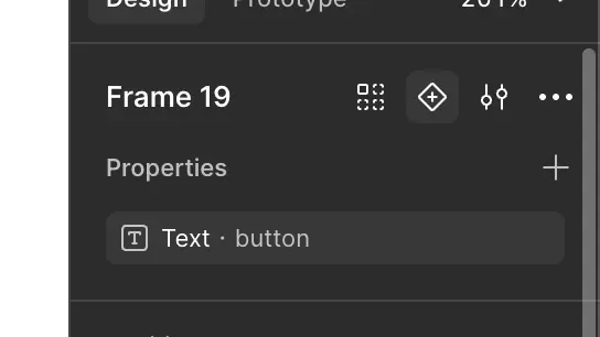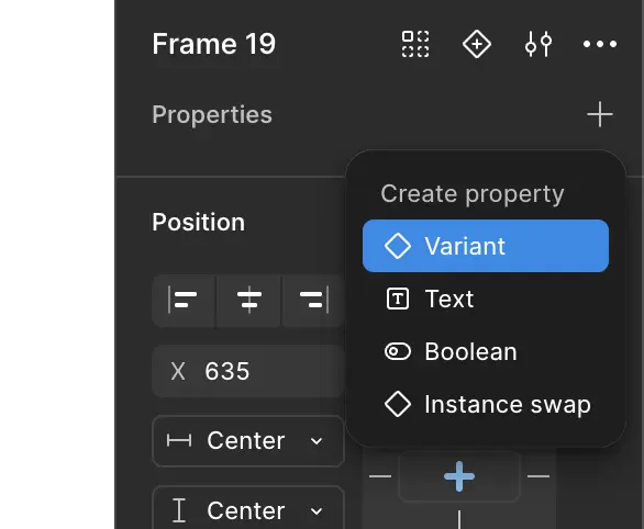 Après avoir sélectionné notre composant, tout en haut du panneau des propriétés se trouve cet icone qui permet de créer une variante. Une fois que votre composant à au moins un variant, cet icone va se retrouver dans un menu contextuelle représenté par les 3 points