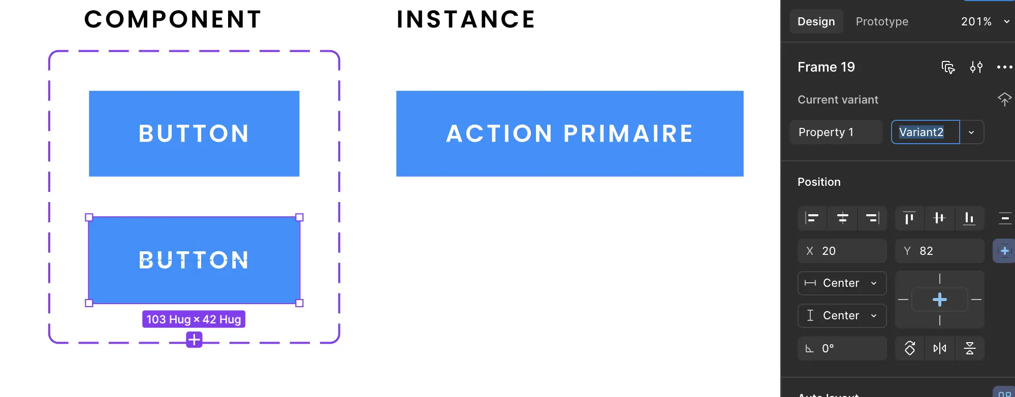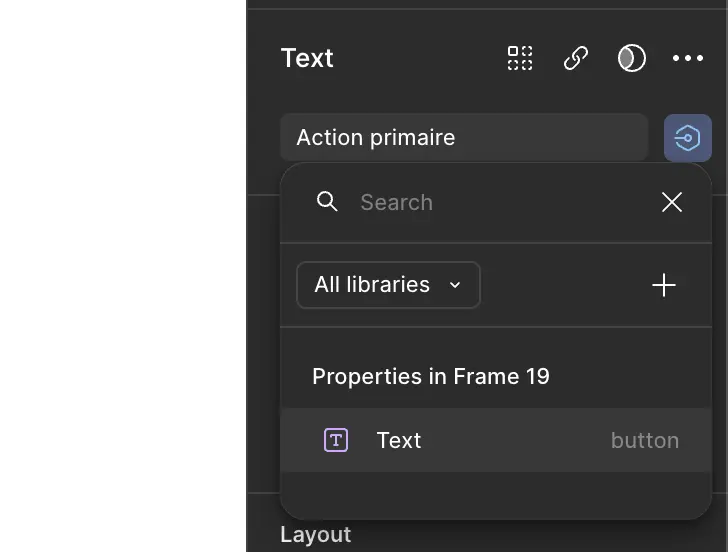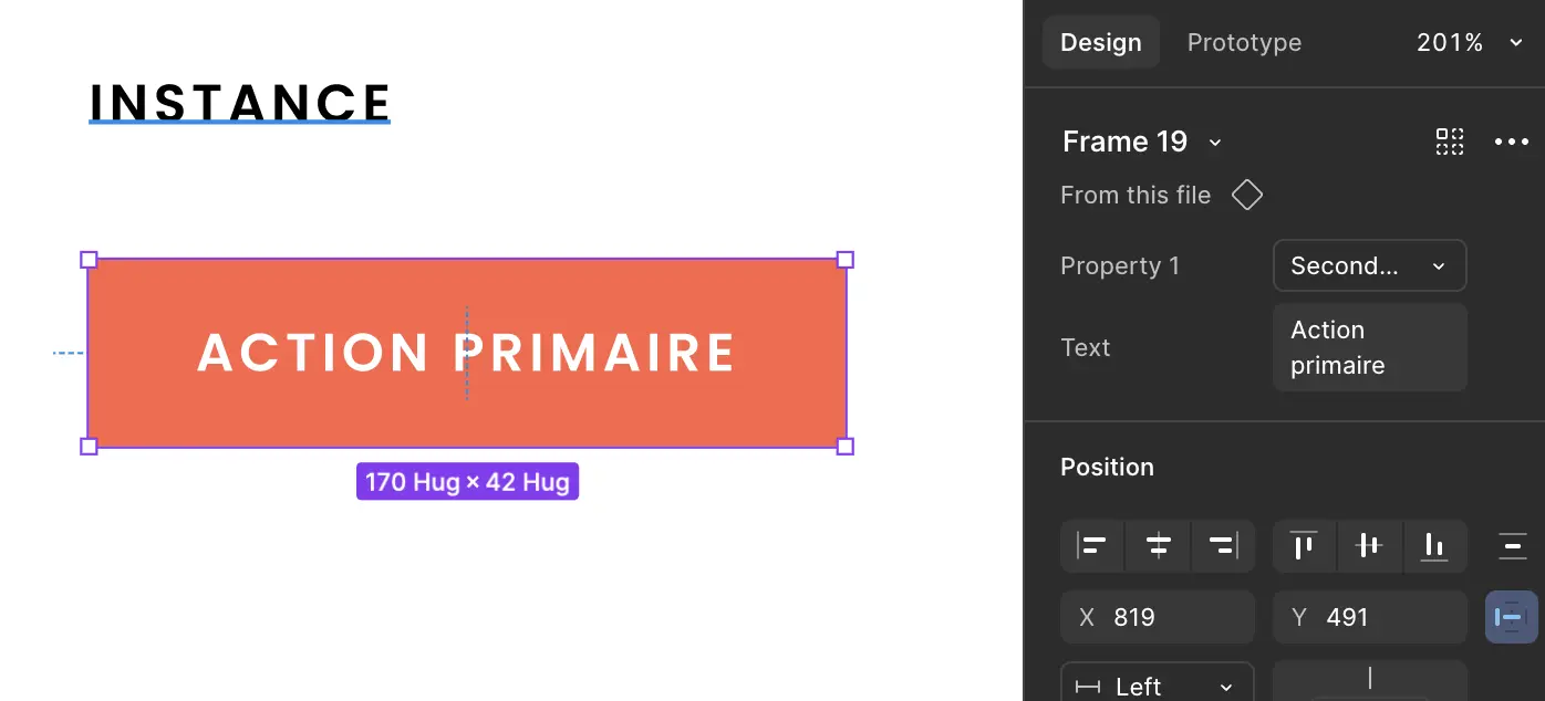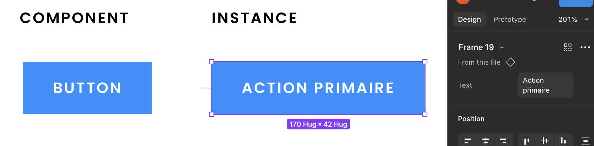 Si on sélectionne notre instance, elle aura accès aux propriétés définies par le composant parent. Dans notre cas, nous avons la propriété text qui a une valeur par défaut button. En modifiant la valeur de ce champ, le texte de notre instance se mettra à jour sans briser la synchronisation avec son parent.