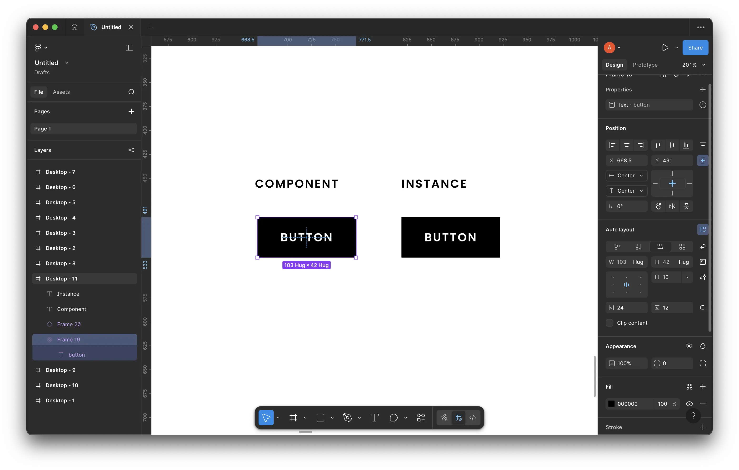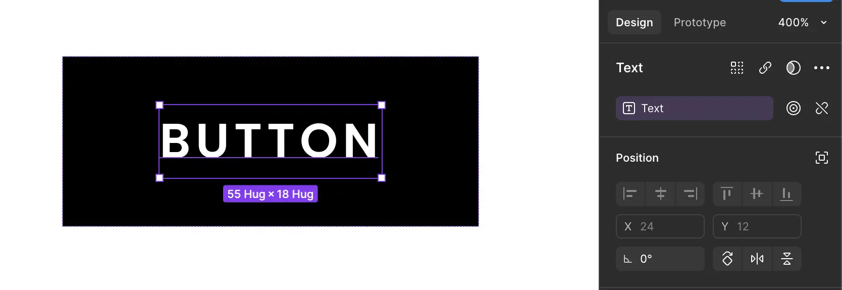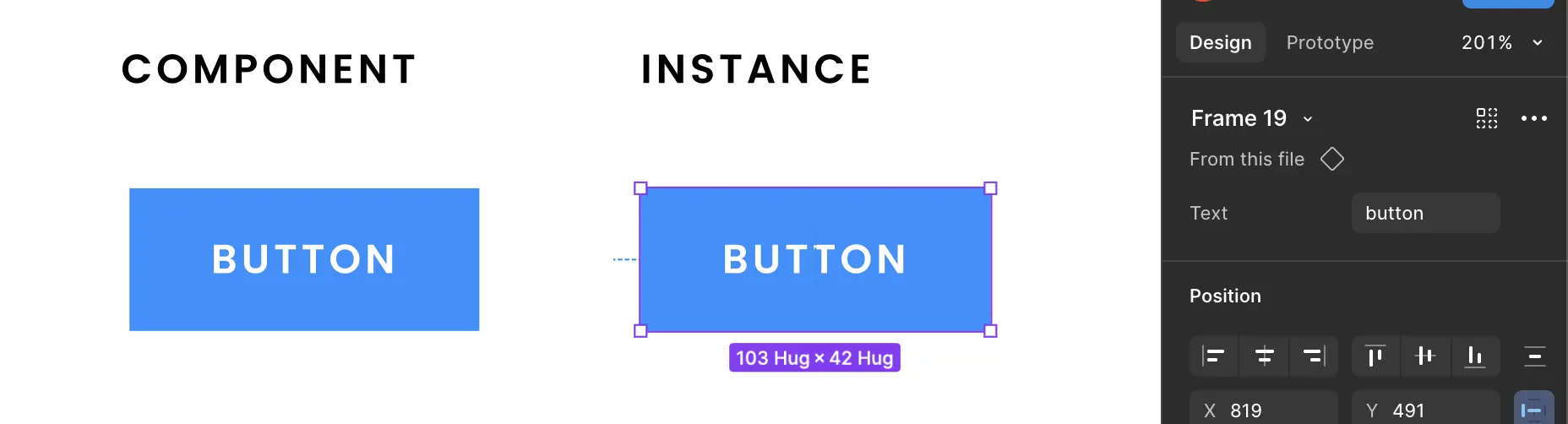 Si on sélectionne notre instance, elle aura accès aux propriétés définies par le composant parent. Dans notre cas, nous avons la propriété text qui a une valeur par défaut button. En modifiant la valeur de ce champ, le texte de notre instance se mettra à jour sans briser la synchronisation avec son parent.