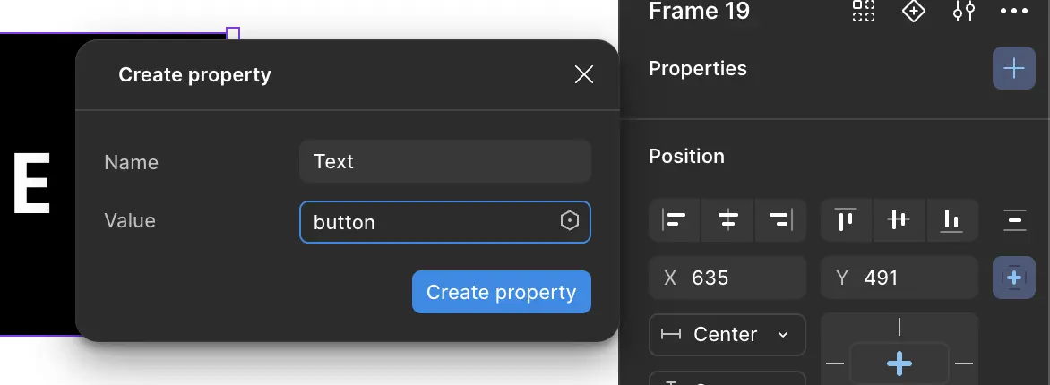 Une fois le composant sélectionné, on trouve tout en haut du panneau des calques se trouve l'option properties et une action create property .