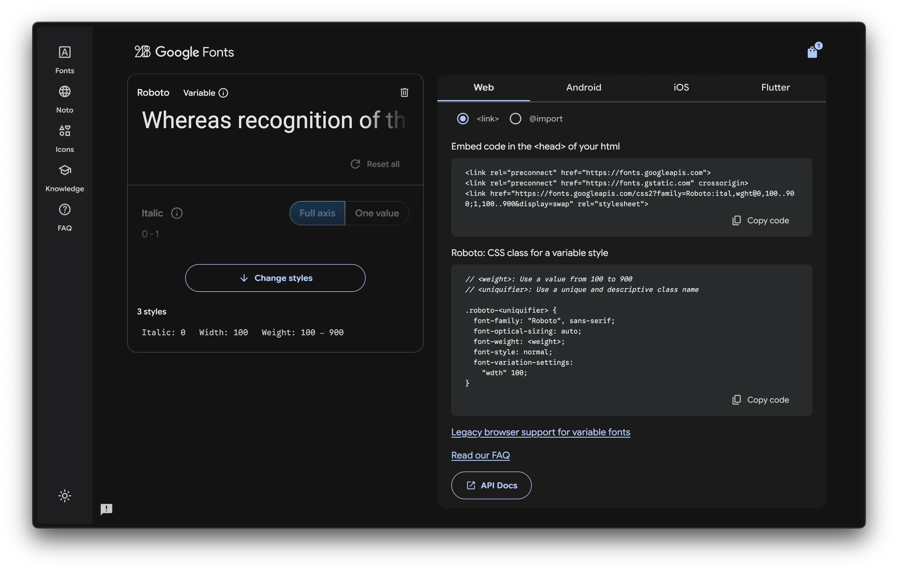 Essayons d'ajouter la police Roboto depuis Google fonts. Le site nous donne des balises et des styles à rajouter dans notre code pour que cela fonctionne :