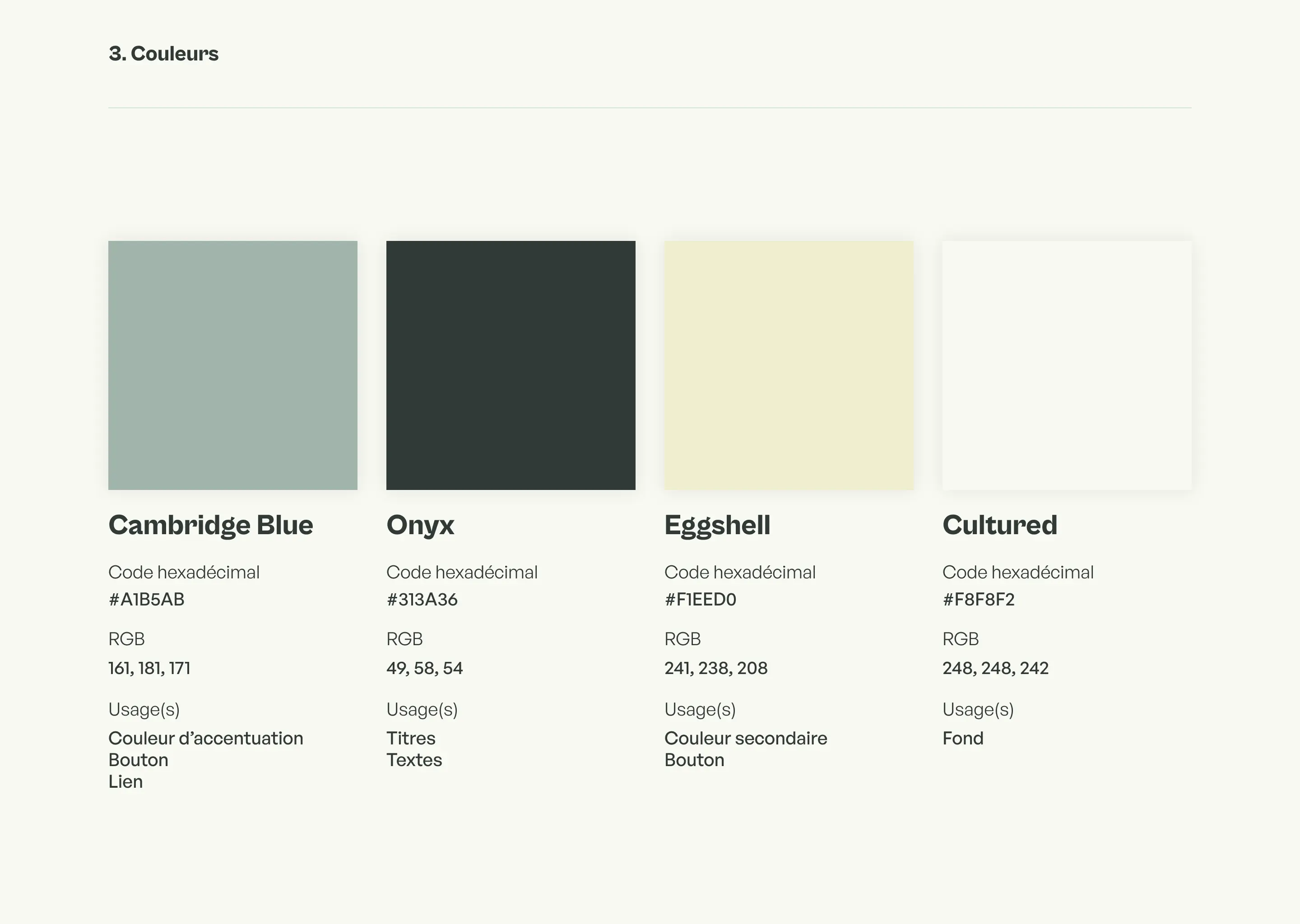 - Une section avec les couleurs et la densité d'utilisation. Chaque couleur doit être nommée via color-name.com, avec 2 références hexadécimal et RVB, ainsi que leurs usages.