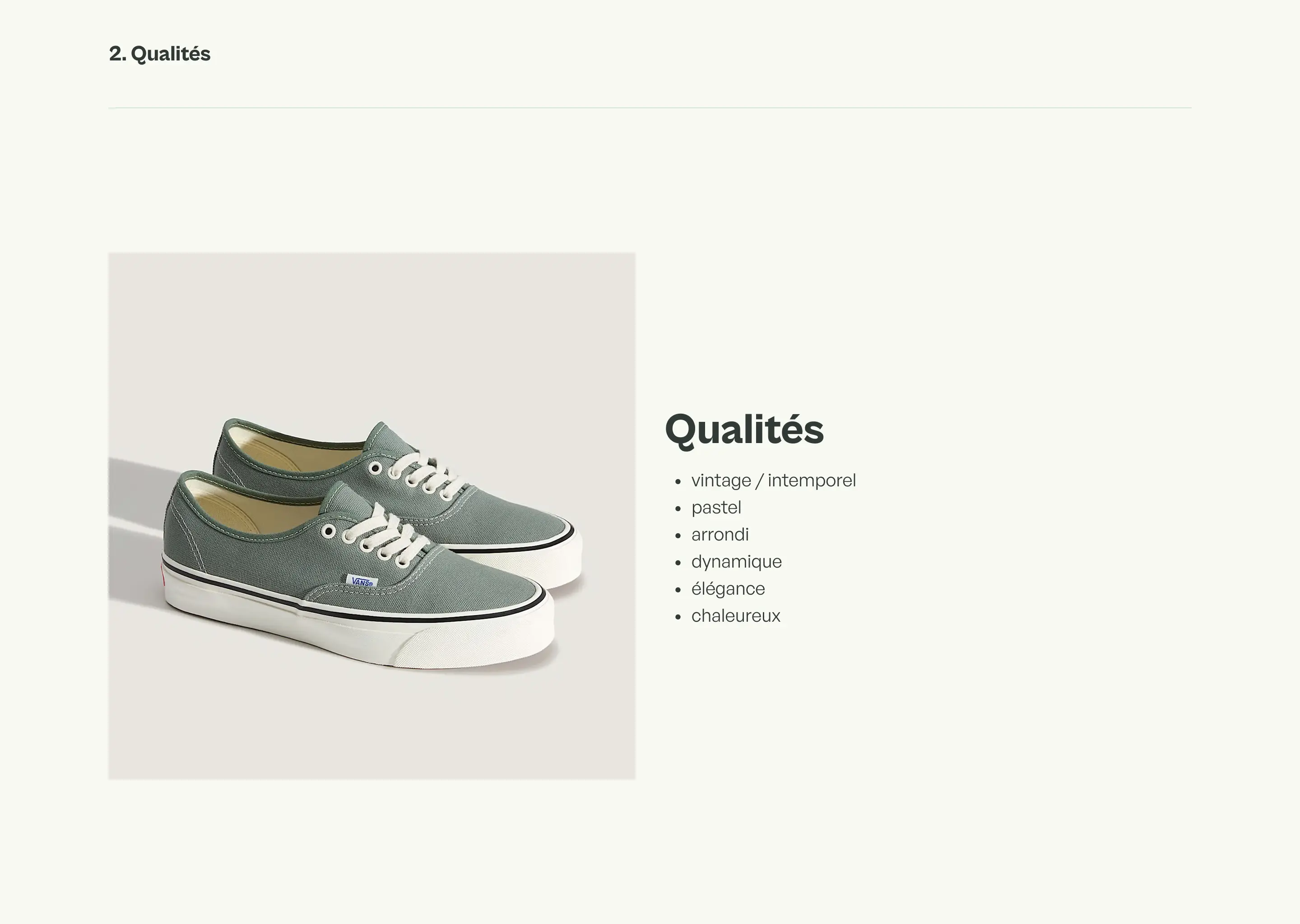 On décrit les différentes qualités ou valeurs véhiculées par le produit / service. Le but est de pouvoir y associer des couleurs, des typographies, des styles qui seront en accord avec ces qualités.
