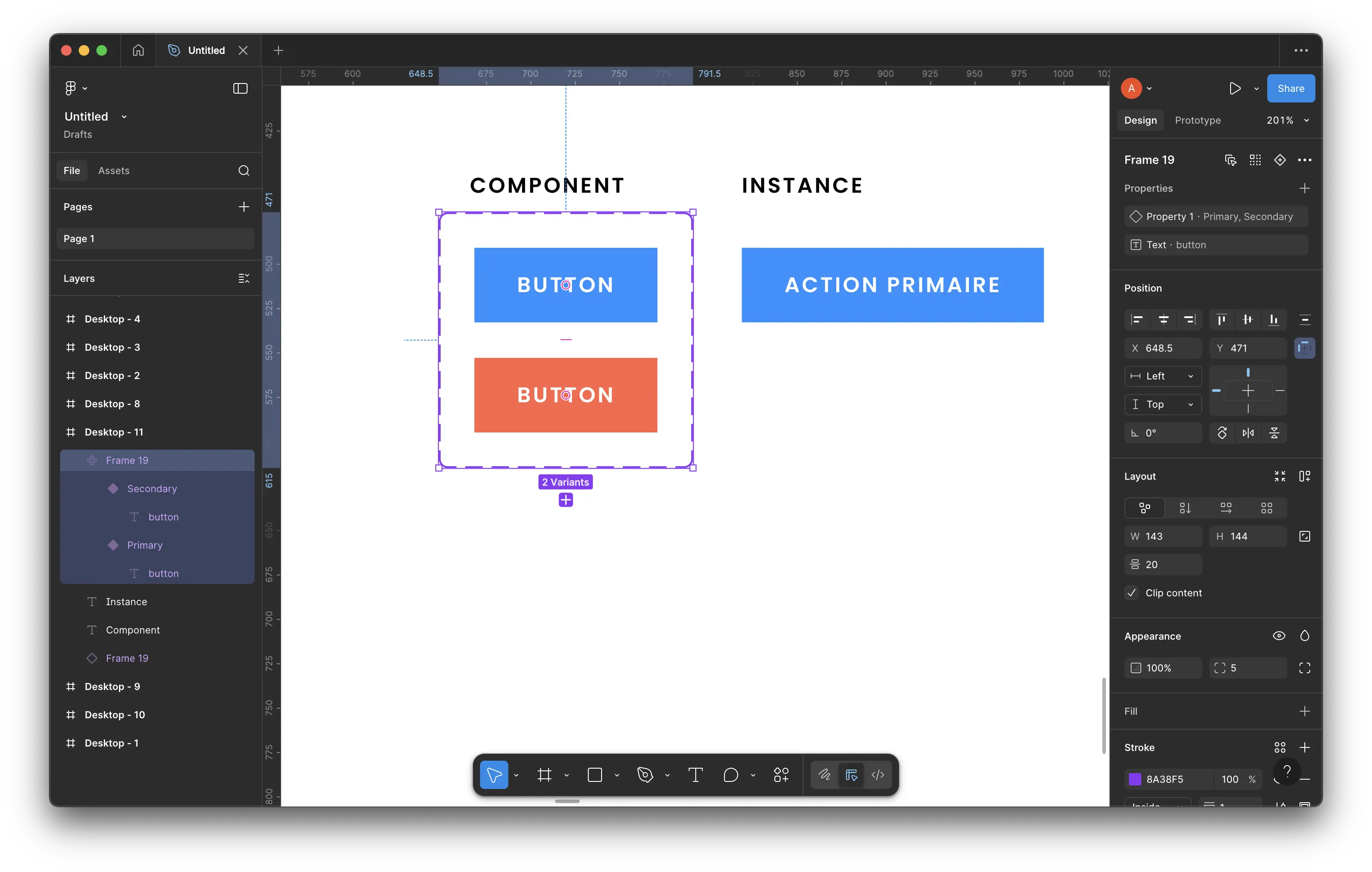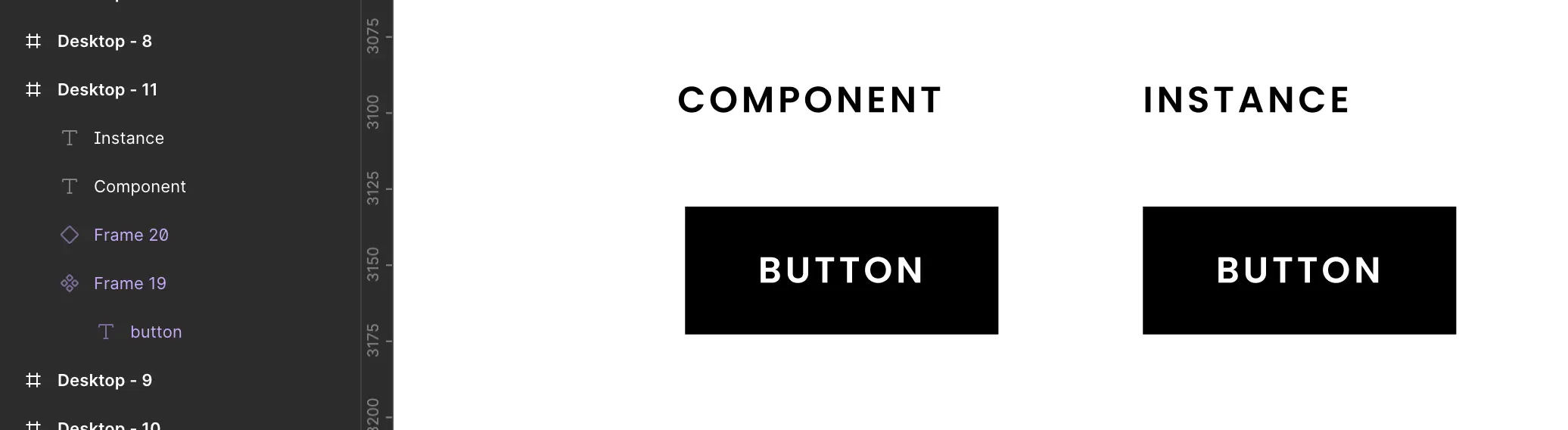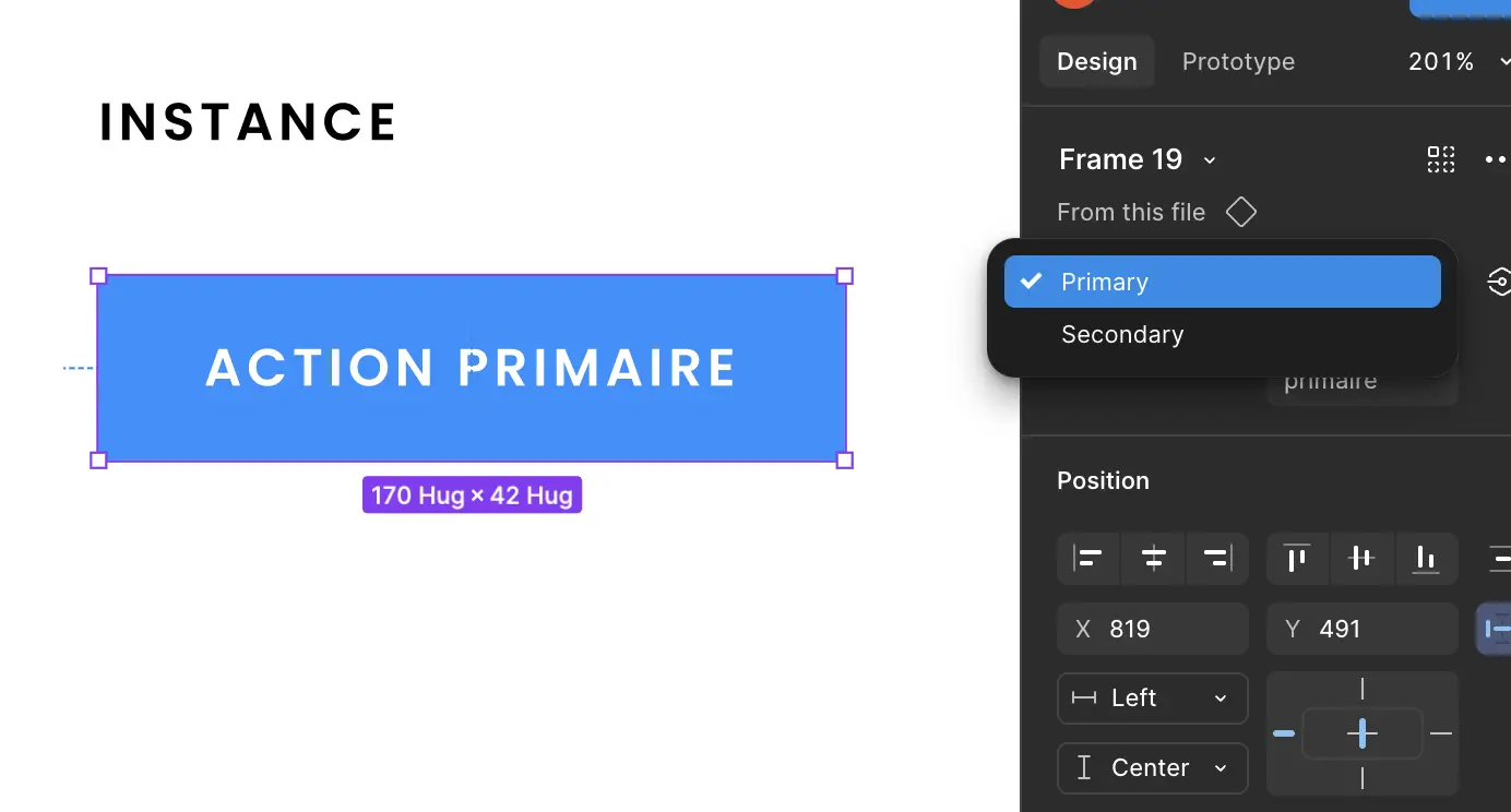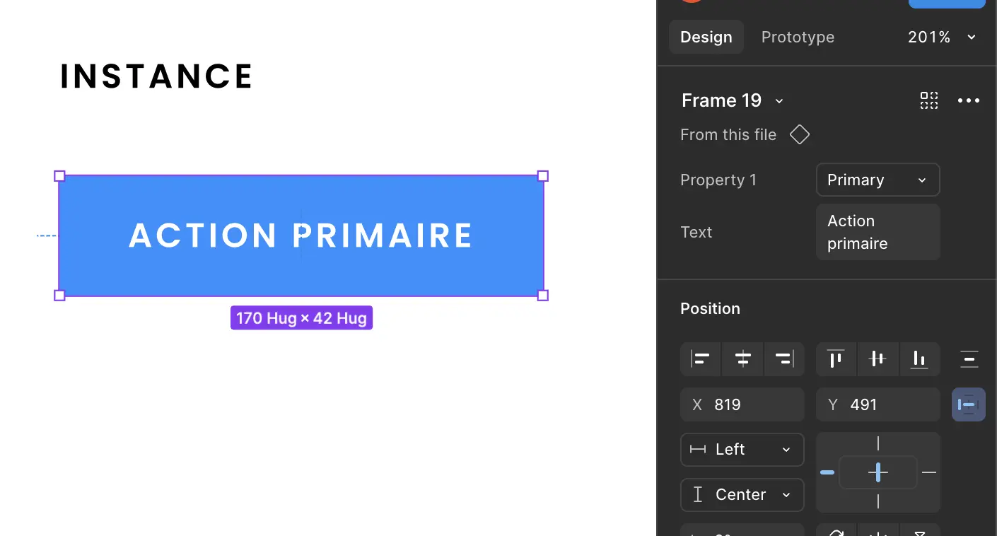 Si on sélectionne notre instance, elle aura accès aux propriétés définies par le composant parent. Dans notre cas, nous avons la propriété text qui a une valeur par défaut button. En modifiant la valeur de ce champ, le texte de notre instance se mettra à jour sans briser la synchronisation avec son parent.