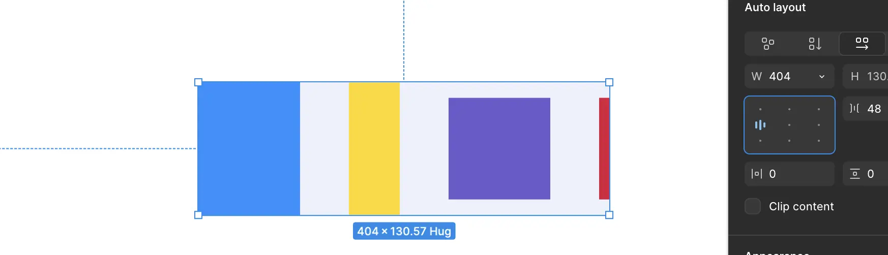 Une flèche rouge nous indique comment la frame va se redimensionner en survolant l'option Hug contents.