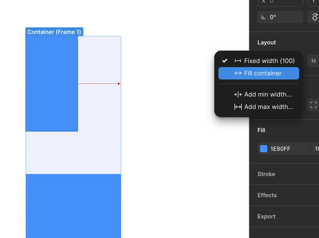 Les éléments enfants d'une frame en auto layout peuvent passer d'une taille fixe définie à une taille lié à celle de la frame via l'option Fill container. Cela forcera la largeur ou la hauteur de prendre la totalité de la place disponible.