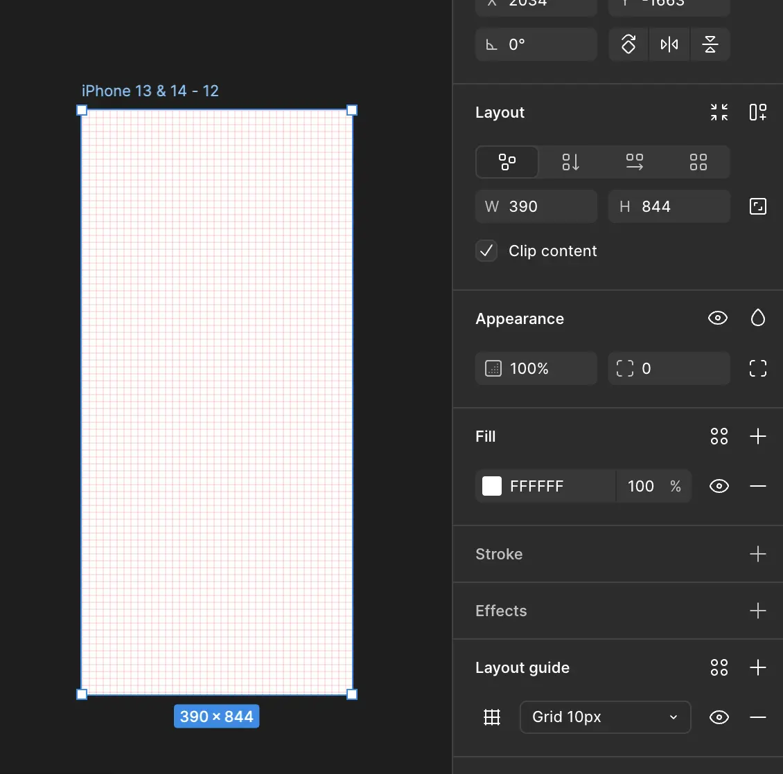 Ajoutons une frame iphone 13 & 14, et selectionnons là. C'est dans le panneau des propriétés, tout en bas, que se trouve l'option permettant d'ajouter une grille: la section layout guide.