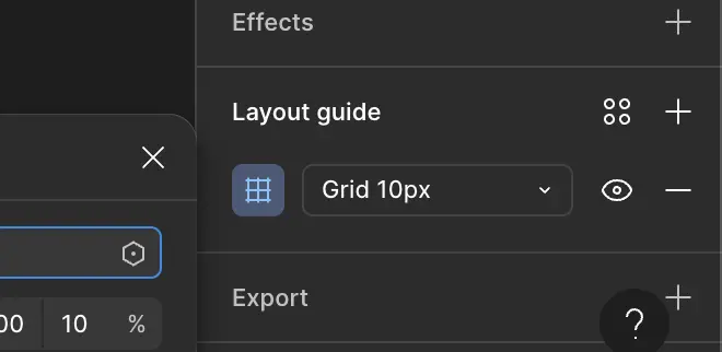 En cliquant sur l'icône + , cela ajouter une grille avec un maillage rouge. On peut voir maintenant une nouvelle ligne dans la section layout guide mentionnant Grid 10px.